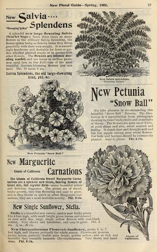 Keywords: New floral guide (16240888364).jpg New Floral Guide Spring 1901 <br> 97 <br> New <br> Cal via ’ ’ ’ ’ <br> oop sp es-5plendens <br> A splendid new large flowering Salvia <br> Scarlet Sag-e ; bears three times as many <br> flowers as the ordinary Salvia Splendens the <br> flower spikes being so heavily laden they droop <br> gracefully with their own weight It is exceed- <br> ingly handsome and desirable for lawn or gar- <br> den whether planted singly or in groups with <br> other flowers The flowers are intense daz <br> zling scarlet and are borne in endless profu- <br> sion until late in the Fall one of the most <br> beautiful Autumn-blooming flowers you can <br> have Pkt 75 seeds 8 cts <br> Salvia Splendens the old large-flowering' <br> kind pkt 4c <br> New Salvia Splendens <br> Drooping Spikes <br> New Petunia <br> Snow Ball <br> We take pleasure in recommending this <br> beautiful Snow Ball Petunia The illus- <br> tration is a reproduction from photograph <br> showing its dwarf bushy habit and abundance <br> of bloom The flowers are pure snow white <br> of good shape and size sweet scented and <br> lasting It stands heat and drought well and <br> has few equals among pure white flowers <br> For beds and borders should be extensively <br> planted Sure to please Pkt 6 CtS <br> New Petunia ’'Snow Ball ' <br> New Marguerite <br> Giants of California <br> Carnations <br> The Giants of California Dwarf Marguerite Carna- <br> nations are a splendid new strain bearing flowers of <br> Giant size full reΒ§ ular form many beautiful colors <br> and delicious fragrance The plants are of dwarf <br> bushy growth very free flowering and easy to grow <br> and as they bloom as quick as other Marguerite Car- <br> nations they are a most desirable novelty Pkt 8 CtS <br> New Single Sunflower Stella <br> Stella is a beautiful new variety makes neat bushy plants <br> 3 to 4 feet high with small bright green leaves and covered <br> all over with fine large single yellow flowers with coal-black <br> centres Very showy and handsome and easy to grow Pkt 5 <br> cts Yz oz 20 cts <br> New Clirysaiitliemuin Flowerefl- Sunflower grows 6 to 7 <br> feet high and blooms profusely the whole season Flowers six to seven <br> inches across perfectly double pure bright golden yellow and so rich and <br> beautiful they resemble immense Chrysanthemums Very showy and hand- <br> some Pkt 8 Cts <br> Giants of <br> California 42484259 134532 67120 Page 97 Text http //www biodiversitylibrary org/page/42484259 1901 10 1111/j 1469-7998 1865 tb02381 x Conard Jones Co West Grove Pa ; Henry G Gilbert Nursery and Seed Trade Catalog Collection NameFound Carna NameConfirmed Carna EOLID 8886074 NameBankID 2992271 NameFound Petunia NameConfirmed Petunia Juss EOLID 60149 NameFound Salvia NameConfirmed Salvia L EOLID 38380 NameFound Splendens NameConfirmed SPLENDENS NameBankID 5329910 Biodiversity Heritage Library New floral guide 1901 Garden Stories Bulbs Plants Catalogs Nursery stock Plants Ornamental Roses Seeds U S Department of Agriculture National Agricultural Library bhl page 42484259 dc identifier http //biodiversitylibrary org/page/42484259 Conard Jones Co Flowers West Grove PA Conard Jones Co bhlGardenStories BHLinbloom bulbs plants plants ornamental u s department of agriculture national agricultural library west grove pa conard jones co bhlgardenstories bhlinbloom Information field Flickr posted date ISOdate 2015-03-19 Check categories 2015 August 23 CC-BY-2 0 BioDivLibrary https //flickr com/photos/61021753 N02/16240888364 2015-08-23 23 55 39 cc-by-2 0 PD-old-70-1923 New floral guide 1901 Photos uploaded from Flickr by FΓ¦ using a script |