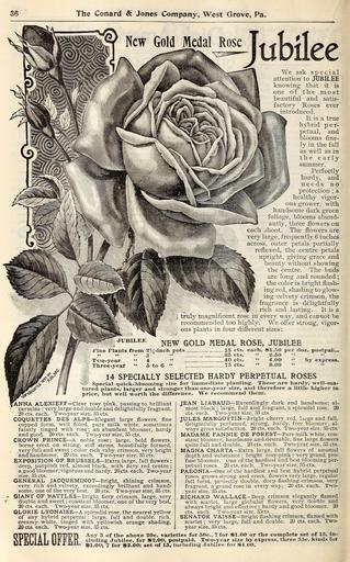| Keywords: New floral guide (16675593778).jpg 36 <br> The Conard Jones Company West Grove Pa <br> New Gold Medal Rose <br> Jubilee <br> We ask special <br> attention to JUBILEE <br> knowing that it is <br> one of the most <br> beautiful and satis- <br> factory Roses ever <br> introduced <br> It is a true <br> hybrid per- <br> petual and <br> blooms fine- <br> 1 ' in the fall <br> as well as in <br> the early <br> summer <br> Perfectly <br> hardy and <br> needs no <br> protection ; a <br> healthy vigor- <br> ous grower with <br> handsome dark green <br> foliage blooms abund <br> antly three flowers on <br> each jhoot The flowers are <br> very large frequently 6 inches <br> across outer petals partially <br> reflexed the centre petals <br> upright giving grace and <br> beaut ' without showing <br> the centre The buds <br> are long and rounded ; <br> the color is bright flash- <br> ing red shading to glow- <br> ing velvety crimson the <br> fragrance is delightfully <br> rich and lasting It is a <br> truly magniticent rose in every way and cannot be <br> recommended too highly We oEer strong vigor- <br> ous plants m four different sizes <br> NEW GOLD MEDAL ROSE JUBILEE <br> Fine Plants from 2K-iiich pots 15 fts each SI 50 per doz postpaid <br> ÂŤ 3 25 cts ' 54 50 <br> T- 70-year ˘' 4 40 cts 4 00 by express <br> Three-year 5 to 6 75 cts 8 00 <br> 14 SPECIALLY SELECTED HARDY PERPETUAL ROSES <br> Special quick-blooming pize for immediate ijlanting These are hardy -well-ma- <br> tured plants larger and stronger than one-year size and therefore a little higher in <br> price but well worth the difference We recommend them <br> NNA ALEXIEFF Clear rosy pink passing to brilliant <br> carmine ; ver ' large and double and delightfully fragrant <br> 20 cts each Two-year size 35 cts <br> COQUETTES DES ALPS Elegant large flowers fine <br> cupped form well filled pure milk white sometimes <br> faintly tinged with rose ; an abundant bloomer hardy <br> and good 20 cts each Two-year size 35 cts <br> CROWN PRINCE A noble rose; large bold flowers <br> borne erect on strong stiff stems beautifully formed <br> very full and sweet ; color rich ruby crimson very bright <br> and handsome 20 cts each Two-vear size 85 cts <br> EXPOSITION OF BRUSSELS Extra large full flowers ; <br> deep purplish red almost black with fiery red centre ; <br> a good bloomer; vigorous and hardy 20 cts each Two-year <br> size 35 cts <br> GENERAL JACQUEMINOT Bright shining crimson <br> very rich and velvety exceedingly brilliant and hand- <br> some one of the ver\best 20 cts Two-year size 35 cts <br> GIANT OF battle's Bright fiery crimson large very <br> double and sweet ; constant bloomer one of the very best <br> 20 cts each Two-year size 8 5 cts <br> GLORIE LYONAIS'e a splendid rose the nearest yellow <br> of any hybrid perpetual large full and double rich <br> creamy white tinged with vellowish orange shading <br> 20 cts each Two-year size 3o cts <br> JEAN LIABAUD Exceedingly dark and handsome; al- <br> most black ; large full and fragrant a splendid rose 20 <br> cts each Two-year size 35 cts <br> JULES MARGOTTIN Bright cherry red large and full <br> delightfully perfumed strong hafd ' free bloomer; al- <br> ways gives'satisf action 20 cts each Two-year size 85 cts <br> MADAME FANNIE DE FOREST Pure milk white con- <br> stant bloomer handsome and desirable fine large flowers <br> quite full and double 20 cts each Two-year size 85 cts <br> MAGNA CHARTA -Extra large full flowers of unusual <br> depth and substance ; bright rosy-pink ; very grand pro- <br> fuse bloomer One of the hardiest and best blooming per- <br> petual roses 20 cts each Two-year size 35 cts <br> PAEONIA One of the hardiest and best hybrid perpetual <br> roses grows strong and erect flowers very- large regular <br> full form perfectly double deep flashing crimson very- <br> fragrant a grand rose in every way 20 cts each T'vo- <br> year size 85 cts <br> RICHARD WALLACE-Deep crimson elegantly flamed <br> with scarlet large globular flowers ver\- double and <br> always bright and effective ; hardy and good bloomer 20 <br> cts each Two-vear size 85cts <br> SENATOR VAISS'E- Bright flashing crimson flamed with <br> scarlet ; very large full and double 20 cts each Two- <br> year size 35 cts <br> SPECIAL OFFER <br> Any 3 of the above 20c varieties for 50c 7 for SI 00 or the complete set of 15 in- <br> cluding Jubilee for 3 00 postpaid Two-year size by express three 3oc kind s for <br> 81 00; 7 for S2 00 set of 15 including Jubilee for S4 00 42484198 134532 67120 Page 36 Text http //www biodiversitylibrary org/page/42484198 1901 10 1111/j 1469-7998 1865 tb02381 x Conard Jones Co West Grove Pa ; Henry G Gilbert Nursery and Seed Trade Catalog Collection NameFound Charta NameConfirmed Charta NameBankID 4106878 NameFound Paeonia NameConfirmed Paeonia EOLID 61607 NameBankID 2645593 Biodiversity Heritage Library New floral guide 1901 Garden Stories Bulbs Plants Catalogs Nursery stock Plants Ornamental Roses Seeds U S Department of Agriculture National Agricultural Library bhl page 42484198 dc identifier http //biodiversitylibrary org/page/42484198 Conard Jones Co Flowers West Grove PA Conard Jones Co bhlGardenStories BHLinbloom bulbs plants plants ornamental u s department of agriculture national agricultural library west grove pa conard jones co bhlgardenstories bhlinbloom Information field Flickr posted date ISOdate 2015-03-19 Check categories 2015 August 23 CC-BY-2 0 BioDivLibrary https //flickr com/photos/61021753 N02/16675593778 2015-08-23 23 58 07 cc-by-2 0 PD-old-70-1923 New floral guide 1901 Photos uploaded from Flickr by FĂŚ using a script |