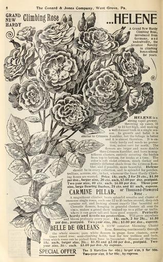 | Keywords: New floral guide (16675745760).jpg The Conard Jones Company West Grove Pa <br> Sir ClimtilngRose <br> HARDY <br> HELENE <br> m <br> A Grand New Hardy <br> Climbing Rose <br> introduced from <br> Germany and <br> undoubtedly the <br> greatest Novelty <br> in climbing <br> Roses offered <br> for years <br> <br> HELENE is a <br> strong rapid grower <br> throwing up canes 10 <br> to 12 feet high and making <br> a well-formed bush in a single sea- <br> son In growth and habit it is <br> similar to Crimson Rambler but the foliage is better <br> and it is almost thornless It is en- <br> tirely hard - and needs no protec- <br> tion unless very far north The <br> flowers are larger and more double <br> than Crimson Rambler and born in mag- <br> nificent clusters entirely covering the bushes <br> from top to bottom for weeks at a time The <br> color is soft violet crimson much darker and <br> entirely different shade from the Crimson Ram- <br> bler and if possible more beautiful Heleiie <br> should be in every collection and is splendid for porches <br> trellises screens etc in fact w-hereverthe finest Hardy Climb- <br> ing Roses are wanted Price 15c each 2 for 25 cts 1 50 <br> perdoz larger size 20 cts each 2 00 per doz postpaid <br> Two-year size 40 cts each 4 00 per doz Three-year <br> size large Bearing Bushes 75 cts and 1 each express <br> CARMINE PILLAR ' ' Xst ' <br> A magnificent climber bears splendid wreaths and cluster of <br> immense single roses each one 12 to 15 inches around deep rich <br> carmine red and looking almost exactly like beautiful red <br> Clematis flowers hanging in graceful clusters all over the <br> vines makes a grand show trained up to a pillar or trellis <br> where it can grow tall and have good support Perleotly <br> liardy and needs no protection Will grow anywhere <br> and bloom profusely every year 15c each 2 for 25c 1 50 <br> per doz postpaid Two-year size 30c ; 3 00 per doz express <br> t I I T P r F ni TFAN ' ' constant blooming Cluster <br> DELLrJD UL \ji\L LrLL\0 Rose flowering continuously through <br> the whole season; pure white flowers in grape form clusters some- <br> times tinted rose; semi-climbing habit best for low trellises and beds <br> from which roses can be picked from June to December Blooms all the time <br> 5c each larger size 20c ; 1 50 and 2 00 per doz postpaid Two- <br> year size 30 each 3 00 per doz by express <br> The 3 Varieties for 40c ; larger size 3 for 50o <br> Two-year size 3 for 8So by exprest <br> SPECIAL OFFER 42484170 134532 67120 Page 8 Text http //www biodiversitylibrary org/page/42484170 1901 10 1111/j 1469-7998 1865 tb02381 x Conard Jones Co West Grove Pa ; Henry G Gilbert Nursery and Seed Trade Catalog Collection NameFound CLEMATIS NameConfirmed Clematis ser Alpina W J Yang L Qian Li EOLID 38289 Biodiversity Heritage Library New floral guide 1901 Garden Stories Bulbs Plants Catalogs Nursery stock Plants Ornamental Roses Seeds U S Department of Agriculture National Agricultural Library bhl page 42484170 dc identifier http //biodiversitylibrary org/page/42484170 Conard Jones Co Flowers West Grove PA Conard Jones Co bhlGardenStories BHLinbloom bulbs plants plants ornamental u s department of agriculture national agricultural library west grove pa conard jones co bhlgardenstories bhlinbloom Information field Flickr posted date ISOdate 2015-03-19 Check categories 2015 August 23 CC-BY-2 0 BioDivLibrary https //flickr com/photos/61021753 N02/16675745760 2015-08-23 23 56 26 cc-by-2 0 PD-old-70-1923 New floral guide 1901 Photos uploaded from Flickr by Fæ using a script |