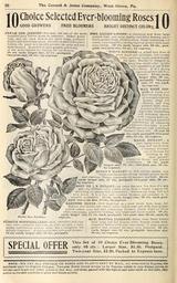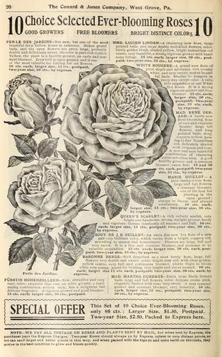 Keywords: New floral guide (16675779890).jpg 0 The Conard Jones Company West Grove Pa <br> I n Choice Selected Ever-blooming Roses 1 H <br> 1 U GOOD GROWERS FREE BLOOMERS BRIGHT DISTINCT COLORS 1 U <br> PER LE DES JARDINS ” Not new but one of the most <br> beautiful deep Yellow Roses in existence Makes grand <br> buds and tne open flowers are extra large perfectlj- <br> double and dcliciously sweet; the color is pure rich Golden <br> Yellow the plant is a healthy- grower an earh- and con- <br> stant bloomer Does well in open ground and is one <br> of the mo ;t aluable for forcing for cut flowers ž <br> 10 cts each; larger size 15 cts postpaid y ' <br> two-year size 30 cts by express <br> Perle des Jardins <br> MME LUCIEN LINDEN ” A charming new Rose large <br> pointed buds and large double well-filled flowers; color <br> loveh- golden blush shaded 5-ellow bright nasturtium red <br> centre ver - beautiful a strong vigorous grower with hand- <br> some foliage 15 cts each; larger size 20 cts post- <br> paid; two-year Mze 35 cts by express <br> WHITE BOUGERE-A grand new Rose of <br> iffiWlllpX reat depth and substance rich creamy <br> llji-J 11 -white and\erv sweet; makes beauti- <br> ful buds Similar to Bougere in <br> _e\erv wa\ except color A valu- <br> able acquisition to our U'hite <br> c Roses It is a strong <br> igorous grower and free- <br> bloomer 15 cts each; <br> larger size 20 cts <br> postpaid; two-year <br> size 35 cts each <br> by express <br> MAD RENE GER- <br> ARD ”A lovely new <br> Ever-blocmiug Rose <br> of rare and exquisite <br> beauty; large full <br> flowers and long <br> pointed buds; deep <br> copper\- -yellow pass- <br> ing to fine jSasturtium <br> led delicately shaded <br> ith crimson and rose <br> \ new and ver\' beautiful <br> combination of 'charming <br> ' £W - 1- 1 ' ' iF' Jj colors not often seen A good <br> - - A health grower and a constant <br> bloomer extra fine 15 and 20 <br> ct«» each postpaid; two-year <br> size 35 ts by express <br> MARLE GUILLOT ” A <br> piiie siiow '-white Rose; <br> 1 irge and full flowers <br> a constant bloomer <br> one of the best for <br> planting in the <br> open - ground ; <br> 111 bloom; and always <br> - atistdctoi-v 10 cts each <br> i/t 15 cts two-year size 30 cts <br> h express <br> QUEEN S SCARLET ” A rich \elvety scarlet very <br> bright ind hand'-ome strong upright grower hardy <br> and Mgorou' bloom-- constanth all Suiiimcr and Fall 10 cts <br> each; lai ger size 15 cts postpaid; two-year size 30 cts <br> by express <br> OUV DE J B GUILLOT ” An extra fine ne\ Tea Rose of a new <br> and\er3 brilliant color \\ hich \aries trom a bright coppery red <br> according to season and temperature Flov ers are large full and <br> \er s et It is a free and ccmstant bloomer and promises to be <br> \aluable acquisition 15 cts each; larger size 20 cts each post- <br> l aid two-jear size 35 cts bj express <br> BARONNE BERGE ” Well described as a most lo\ely Rose large full <br> flower- \en double and sweet color bright ros\ red with clear golden- <br> 5 ellow centre xer full and continuous bloomer plants begin to bloom <br> while \er\ joung grand for beddiiie \er\ bright and s \eet scented 10 cts <br> each; larger size 15 cts each postpaid; two-year size 30 cts each by <br> express <br> FURSTIN HOHENZOLLERN ” New attractive and very <br> rare; color exquisite lilac rose on ochre ground; a fasci- <br> nating combination seldom seen; has a delightful but <br> delicate fragrance A vigorous grower and good bloomer <br> 15 cts eacb; larger size 20 cts postpaid <br> MAD MARTHA DUBERGE ” Extra large finely formed <br> buds large and full flowers color delicate cream pink <br> elegantly flushed with rose; verv sweet A neat compact <br> grower and constant bloomer; very beautiful 10 cts <br> each larger size 15 cts postpaid; two-year size <br> 30 cts by express <br> SPECIAL OFFER <br> This Set of 10 Choice Ever-Blooming Roses <br> only 95 cts ; Larger Size 1 30 Postpaid <br> Two year Size 2 50 Packed to Express here <br> NOTE ” WE PAY ALL POSTAGE ON ROSES AND PLANTS SENT BY MAIL but when sent by Express the <br> purchaser pays the Express Charges Two-year Roses should always go by Express unless to very distant points as <br> we can send larger and better plants in this way and when packed with the tops on and some earth on the roots they <br> arrive in the best condition to grow and bloom quickly 42484182 134532 67120 Page 20 Text http //www biodiversitylibrary org/page/42484182 1901 10 1111/j 1469-7998 1865 tb02381 x Conard Jones Co West Grove Pa ; Henry G Gilbert Nursery and Seed Trade Catalog Collection Biodiversity Heritage Library New floral guide 1901 Garden Stories Bulbs Plants Catalogs Nursery stock Plants Ornamental Roses Seeds U S Department of Agriculture National Agricultural Library bhl page 42484182 dc identifier http //biodiversitylibrary org/page/42484182 Conard Jones Co Flowers West Grove PA Conard Jones Co bhlGardenStories BHLinbloom bulbs plants plants ornamental u s department of agriculture national agricultural library west grove pa conard jones co bhlgardenstories bhlinbloom Information field Flickr posted date ISOdate 2015-03-19 Check categories 2015 August 23 CC-BY-2 0 BioDivLibrary https //flickr com/photos/61021753 N02/16675779890 2015-08-23 23 56 00 cc-by-2 0 PD-old-70-1923 New floral guide 1901 Photos uploaded from Flickr by Fæ using a script |