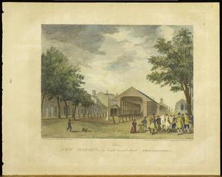 Keywords: library company of philadelphia librarycompanyofphiladelphia african americana africanamericana second street secondstreet headhouse headhouse market headhousemarket south philadelphia southphiladelphia engravings fiddle boys streets architecture cows marketplace philadelphia photo border outdoor Street scene with a view of the New Market shed on South Second Street. Depicts a group of men, women, and children gathered by a bull decorated with garlands of flowers near the shed, possibly a procession of a butcher's trade association. An African American fiddle player entertains the group as an African American boy runs toward them. Attached to the back of the shed is the fire engine house with cupola, known as the headhouse." The New Market, erected about 1745, was created following a petition by the growing population of South Philadelphia residents who found it a hardship to cross Dock Creek to reach the High Street. The shed was razed in 1956 and rebuilt in 1963. p-2276-35. Drawn, Engraved & Published by W. Birch & Son. 1799. Link to record on ImPAC, the Library Company’s digital collections catalog: lcpdams.librarycompany.org:8881/R/-?func=dbin-jump-full&a... Street scene with a view of the New Market shed on South Second Street. Depicts a group of men, women, and children gathered by a bull decorated with garlands of flowers near the shed, possibly a procession of a butcher's trade association. An African American fiddle player entertains the group as an African American boy runs toward them. Attached to the back of the shed is the fire engine house with cupola, known as the headhouse." The New Market, erected about 1745, was created following a petition by the growing population of South Philadelphia residents who found it a hardship to cross Dock Creek to reach the High Street. The shed was razed in 1956 and rebuilt in 1963. p-2276-35. Drawn, Engraved & Published by W. Birch & Son. 1799. Link to record on ImPAC, the Library Company’s digital collections catalog: lcpdams.librarycompany.org:8881/R/-?func=dbin-jump-full&a... |