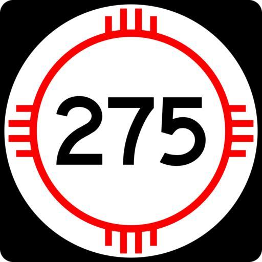 | Keywords: New Mexico 275.svg 750 mm by 750 mm 30 in by 30 in New Mexico state road shield made to the specifications of the http //nmshtd state nm us/upload/images/Plans_Specs_Estimates/Division 20700/701/701 pdf PS E Standard Drawings which specifies a 30 by 30 shield for 3-digit roads Pictures of actual shields were also used for reference Uses the Roadgeek 2005 fonts United States law does not permit the copyrighting of typeface designs and the fonts are meant to be copies of a U S Government-produced work anyway self-created using Inkscape and Image New Mexico 3di svg 2008-03-26 Mr Matté Own work all rights released Public domain New Mexico State Road shields Shields created by User Mr Matté |