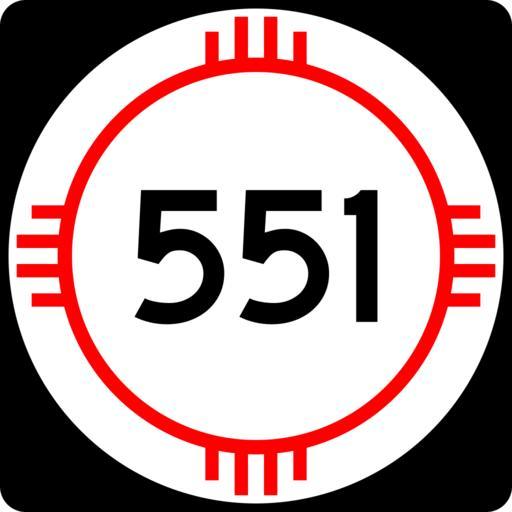 Keywords: New Mexico 551.svg 750 mm by 750 mm 30 in by 30 in New Mexico state road shield made to the specifications of the http //nmshtd state nm us/upload/images/Plans_Specs_Estimates/Division 20700/701/701 pdf PS E Standard Drawings which specifies a 30 by 30 shield for 3-digit roads Pictures of actual shields were also used for reference Uses the Roadgeek 2005 fonts United States law does not permit the copyrighting of typeface designs and the fonts are meant to be copies of a U S Government-produced work anyway self-created using Inkscape and Image New Mexico 3di svg 2008-03-26 Mr Matté Own work all rights released Public domain New Mexico State Road shields Shields created by User Mr Matté |