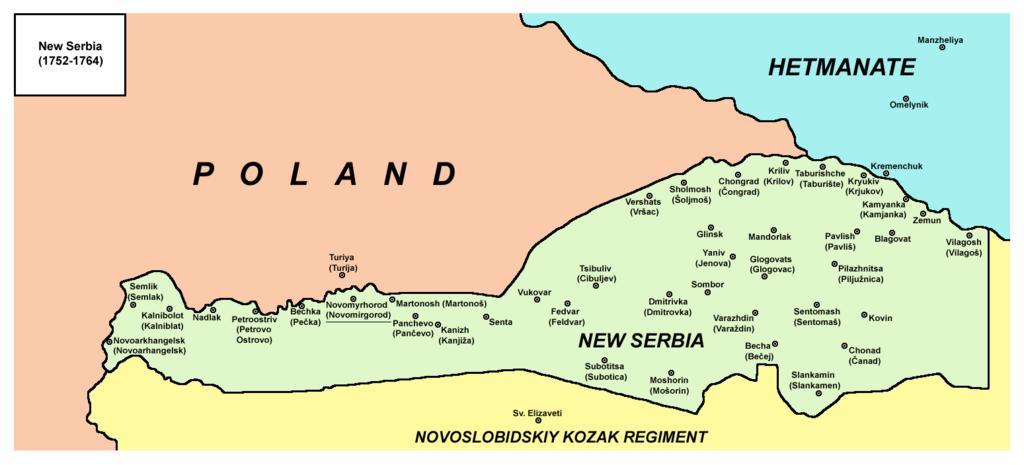 Keywords: New serbia map.png English Map of New Serbia a territory of Imperial Russia from 1752 to 1764 Serbian Mapa Nove Srbije teritorije Ruskog carstva između 1752 i 1764 godine Source and licence Self-made map by PANONIAN PANONIAN References Mita Kostić Nova Srbija i Slavenosrbija Novi Sad 2001 Olga M Posunjko Istorija Nove Srbije i Slavenosrbije Novi Sad 2002 Pavel Rudjakov Seoba Srba u Rusiju u 18 veku Beograd 1995 http //www rastko rs/rastko-ukr/istorija/img/nova_serbija jpg http //www irekw internetdsl pl/27_1727-1768 jpg http //www jewishgen org/Ukraine/maps/Ukrainian-Land-1750 jpg Place names wikitable style text-align right - Older Ukrainian/Russian name 1 Serbian name from the middle of the 18th century Ukrainian/Russian name from the middle of the 18th century 1 Newer or modern Ukrainian/Russian name 1 - Skaleva Semlak 2 Semlik Skaleva - - Novoarhangelsk / Arhangelsk Novoarkhangelsk / Novoarkhangelysk Novoarkhangelsk / Novoarkhangelysk - Ganivka Kalniblat / Kalnibolot Kalnibolot / Kalynibolot Kalynibolota - - Nadlak 2 Nadlak Nadlak - Davidivka Petrovo Ostrovo / Petro-Ostrov 2 Petroostriv Petroostriv - Korobchino Pečka 2 Bechka Korobchine - Trisyaga Novomirgorod / Novi Mirgorod Novomirgorod Novomyrhorod / Novomirgorod - Yermina Balka Martonoš 2 Martonosh Martonosha - Olykhovatka Pančevo 2 Panchevo Pancheve - Tri Bayraki Kanjiža 2 Kanizh Kanizh - Mogilovo Senta 2 Senta Mogiliv / Rodnikivka - - Vukovar 2 Vukovar Bukvarka - - Feldvar / Fedvar 2 Fedvar Pidlisne - Mala Adzhamka Subotica 2 Subotitsa Subottsi - Nekrasivska Mošorin 2 Moshorin Moshorine - - Cibuljev / Cibulev Tsibuliv Tsibuleve - - Dmitrovka Dmitrivka Dmitrivka - Dikivka Sombor 2 Sombor Dikivka - Protopopivka Varaždin 2 Varazhdin Protopopivka - Usikivka Bečej 2 Becha Usikivka / Oleksandriya - - Glinsk Glinsk Glinsk - Pantaziyivka Jenova Yaniv Ivanivka - - Mandorlak 2 Mandorlak - - Kosivka Glogovac 2 Glogovats Kosivka - Butivka Pavliš 2 Pavlish Pavlish - - Piljužnica Pilazhnitsa - - Onufriyivka Blagovat Blagovat Onufriyivka - - Sentomaš 2 Sentomash - - - Kovin 2 Kovin - - - Čanad 2 Chonad - - - Slankamen 2 Slankamin - - Nesterivka Vršac 2 Vershats Vershatsi - Stetsivka Šoljmoš / Šolmoš 2 Sholmosh Stetsivka - Andrusivka Čongrad 2 Chongrad Velika Andrusivka - - Krilov Kriliv Kriliv - - Taburište / Taburino Taburishche Svitlovodsk - - Krjukov Kryukiv Kryukiv - - Kamjanka / Kamenka Kamyanka Kamyani Potoki - Plakhtiyivka Zemun 2 Zemun Uspenka - Deriyivka Vilagoš 2 Vilagosh Deriyivka - - Turija 2 3 Turiya Turiya Notes 1 Ukrainian and Russian names are given in Latin script transliterations 2 These names were brought by Serbs from their old homeland in southern Pannonian Plain Places with same names are also existing or existed in modern-day Serbia Vojvodina Croatia Romania and Hungary 3 Serb settlement of Turiya Turija was located in what sources are describing as a nominal Polish territory The border between New Serbia and Poland was however often disputed and unstable Maps of New Serbia Novomyrhorod |