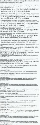 Keywords: New Turkic alphabets.jpg badJPEG New Turkic alphabets svg Dieses Bild zeigt verschiedene lateinisch-basierte Alphabete sogenanntes Einheitliches Alphabet der Turkvölker in den frühen 1920er Jahren bis zu deren Ablösung durch russisch-basierte Kyrillaphabete ab 1938/40 Daneben werden einige moderne turkvölkische Alphabete sogenannte neue türkische Alphabete angeführt die sich vom modernen Lateinalphabet der Türkei ableiten Hinweise/Notes Die verschiedenen Lateinalphabete wurden zwischen 1938 und 1940 im Zuge des verstärkten Russisch-Unterrichtes bei den nichtslawischen Völkern Rußlands durch modifizierte Alphabete kyrillischen Ursprungs ersetzt War bei den Lateinalphabeten noch die gegenseitige Lesbarkeit erstrebt worden so wurde diese durch die völlig unterschiedlichen Bedeutungen verschiedener kyrillischer Buchstaben durch die Sowjetregierung bewußt erschwert Nach dem Zusammenbruch der UdSSR ab 1989 wurde von Aserbaidschan im Jahre 1991 die Rückkehr zum lateinischen Alphabet beschlossen Dieses Alphabet war dem modernen der Türkei nachempfunden und unterschied sich nur durch drei Sonderzeichen »ä« »x« und »q« vom türkischen Alphabet Diese Sonderzeichen sollten »rein aserbaidschan-türkische« Laute kennzeichen Am 30 Oktober 1992 wurde in der türkischen Hauptstadt Ankara im Zuge der neugegründeten »Schwarzmeer-Kooperation« KEI die OATCT türkisch Orta Asya Türk Cumhuriyetleri Toplantısı Zentralasiengipfel der Turkrepubliken gegründet Diese beschloß auf diesem Gipfel daß ein gemeinsames »türkisches Alphabet« die Entwicklung eines gemeinsamen Grundwortschatzes und die Anlehnung der Rechtschreibung der jeweiligen Staatssprachen an das moderne Türkeitürkische zu erfolgen hatte Ferner sollten die großen Turkstaaten Aserbaidschan Kasachstan Kirgisistan Turkmenien und Usbekistan bis zum Jahre 2005 ein türkisch-lateinisches Alphabet für ihre Staatssprachen eingeführt haben Für die türkischen Minderheiten in den benachbarten Ländern vor allem in Syrien Irak und dem Iran und in der Russischen Föderation wurde eine Einführung des lateinischen Alphabetes auf das Jahr 2010 angesetzt Am 22 Dezember desselben Jahres beschloß der aserbaidschanische Nationalrat »Türkisch« als alleinige Amtssprache und damit verbunden das »neue aserbaidschanische Alphabet« zur Schreibung der Landessprache einzuführen Im Zuge dieser Einführung wurde der Sonderbuchstabe »ä« durch das heutige Zeichen »ə« ersetzt Diese aserbaidschanischen Lateinalphabete übernahmen auch die aserbaidschanischstämmige Minderheit im Iran So wird das moderne Aserbaidschan-Alphabet nun auch inoffiziell und parallel zur Schreibung des Türkischen im Iran benutzt So wird beispielsweise die Zeitschrift »Varliq« seit her in lateinischen Buchstaben gedruckt und vertrieben Im Jahre 1994 wurde das Musteralphabet türkisch Ortak türk Alfabesi gemeinschaftliches türkisches Alphabet der Öffentlichkeit vorgestellt und es wurde in der Türkei auch unter der Bezeichnung »Öz alfabe« unser Alphabet bekannt da sich dieses Musteralphabet mit seinen zahlreichen Zusatzzeichen aus diesem herleiteten Aus diesem Alphabet sind ursprünglich alle Lateinalphabete Zentralasiens abgeleitet; auch Usbekistan und Turkmenistan entwickelten ihre Lateinalphabete aus diesem Musteralphabet Doch diese beiden Staaten gingen schließlich eigene Wege da sie nun “ eine Vorherrschaft Ankaras in Zentralasien vermuteten “ völlig eigenständige Alphabete entwickelten Im Jahre 2000 wurde auch von der tatarischen Regionalregierung in Kasan die Einführung eines Lateinalphabetes beschlossen Dieses geschah als Reaktion darauf daß das russische Parlament im selben Jahr den Beschluß gefaßt hatte daß es in der russischen Föderation nur eine Schriftart zu geben habe das kyrillische Auch übernahmen in diesem Jahr die meisten türkischen Minderheiten des Iran das moderne aserbaidschanische Lateinalphabet zur Schreibung ihrer Sprachen Diese à bernahme war natürlich inoffiziell doch nehmen es momentan alle Regierungsstellen des Iran stillschweigend hin Die türkische Minderheiten Syriens und des Iraks haben zwischenzeitlich die türkische Hoch- und Schriftsprache der Türkei angenommen This picture shows different Latin-based alphabets so-called uniform alphabet of the Turkic peoples from the early 1920s up to their replacement by Russian-based Cyrillic alphabets starting from 1938/40 Some modern Turkic alphabets so-called new Turkic alphabets are given as well which are derived from the modern Latin alphabet of Turkey The different Latin alphabets were replaced by modified alphabets of Cyrillic origin between 1938 and 1940 in the course of intensified instruction of the non-Slavic peoples of Russia in the Russian language Although the Latin alphabets were devised for mutual legibility the Soviet government consciously made it more difficult because of the completely different meanings of different Cyrillic letters After the collapse of the USSR starting from 1989 it was decided by Azerbaijan in the year 1991 to return to the Latin alphabet This alphabet was shared by modern Turkey and differed from the Turkish alphabet only in having three special characters ä x and q These special characters represented purely Azerbaijan-Turkish sounds On October 30 1992 in the Turkish capital Ankara the OATCT Turkish Orta Asya Türk Cumhuriyetleri Toplantısı central Asia summits of the Turkic Republics was created as a result of the newly created Black Sea Co-operation KEI At this summit it was decided that a common Turkish alphabet had to be devised to which the modern Turkish language would be used as a basis for development of a common basic vocabulary and the orthography of the respective state languages Furthermore the large Turkic-language speaking countries of Azerbaijan Kazakhstan Kirgizistan Turkmenistan and Uzbekistan should have the Turkish Latin alphabet introduced for their state languages by the year 2005 Fo