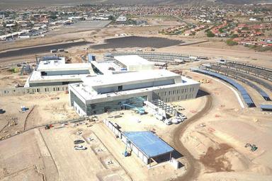 | Keywords: fort irwin fortirwin weed army community hospital weedarmycommunityhospital national training center nationaltrainingcenter wach ntc meddac new hospital newhospital u.s. army usarmy master sergeant dillion mastersergeantdillion csm albert harris csmalbertharris mater sergeant jones matersergeantjones col. jason wieman coljasonwieman treating patients like family treatingpatientslikefamily united states army unitedstatesarmy soldiers the box thebox mojave troop support troopsupport resiliency center resiliencycenter soldier readiness soldierreadiness health health benefits healthbenefits army triad armytriad preventive medicine preventivemedicine aerial road outdoor FORT IRWIN, Calif. – The Weed Army Community Hospital replacement hospital, scheduled for completion in the fall of 2016 was conceived to improve the medical care provided to Soldiers, military families, and retirees in the Fort Irwin community. No less important, the hospital will also support brigade-size units that rotate in and out regularly for training at the National Training Center, Fort Irwin's largest tenant. Since 2001 rotating units have been trained at the NTC for tours to Afghanistan and Iraq and are today being prepared for deployments to potential international trouble spots, peace-keeping missions and in support of allies around the globe. Renewable energy systems, including a photovoltaic array and a solar thermal array of panels, take advantage of the hospital site's harsh desert sun; though the hospital will draw on the local power grid during the night, it will more than make up for its daytime electricity consumption by harnessing the power of sunlight. By incorporating the best practices of premier health facilities throughout the country, implementing targeted sustainability measures to reach significant milestones for healthcare design, and working collaboratively among military healthcare professionals in a tight, streamlined approach, the design of the Weed Army Community Hospital stands as a substantial accomplishment for military healthcare. Under the US Green Building Council's LEED-BD+C rating system, the design should achieve 87 credits, seven more than required for full Platinum status. To learn more about the people and facilities of the National Training Center and the Weed Army Community Hospital visit their official websites at www.irwin.army.mil or www.irwin.amedd.army.mil Photo by Michael Beaton, WACH Public Affairs (Released). FORT IRWIN, Calif. – The Weed Army Community Hospital replacement hospital, scheduled for completion in the fall of 2016 was conceived to improve the medical care provided to Soldiers, military families, and retirees in the Fort Irwin community. No less important, the hospital will also support brigade-size units that rotate in and out regularly for training at the National Training Center, Fort Irwin's largest tenant. Since 2001 rotating units have been trained at the NTC for tours to Afghanistan and Iraq and are today being prepared for deployments to potential international trouble spots, peace-keeping missions and in support of allies around the globe. Renewable energy systems, including a photovoltaic array and a solar thermal array of panels, take advantage of the hospital site's harsh desert sun; though the hospital will draw on the local power grid during the night, it will more than make up for its daytime electricity consumption by harnessing the power of sunlight. By incorporating the best practices of premier health facilities throughout the country, implementing targeted sustainability measures to reach significant milestones for healthcare design, and working collaboratively among military healthcare professionals in a tight, streamlined approach, the design of the Weed Army Community Hospital stands as a substantial accomplishment for military healthcare. Under the US Green Building Council's LEED-BD+C rating system, the design should achieve 87 credits, seven more than required for full Platinum status. To learn more about the people and facilities of the National Training Center and the Weed Army Community Hospital visit their official websites at www.irwin.army.mil or www.irwin.amedd.army.mil Photo by Michael Beaton, WACH Public Affairs (Released). |