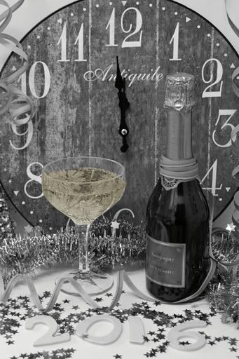 | Keywords: new year's eve new year's greetings clock champagne new year abut drink alcohol celebrate festival sparkling wine bottle champagne bottles champagne glasses prost alcoholic benefit from unopened just before twelve black and white party celebration streamer |