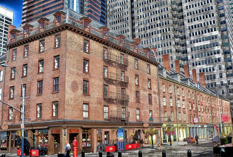 Keywords: new york city urban cityscape buildings stores shops people street outside vehicles sidewalk hdr