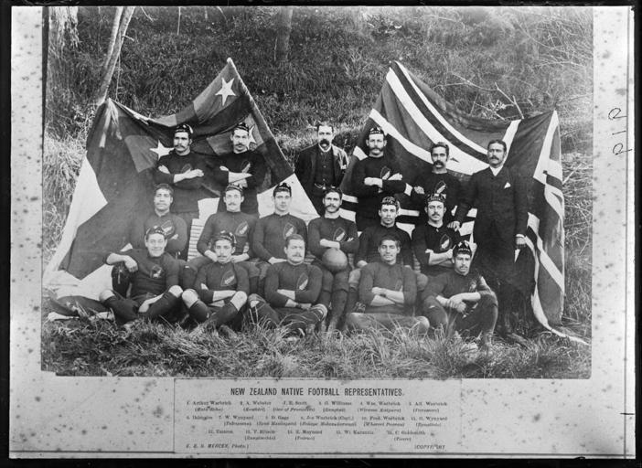 | Keywords: New Zealand Natives football team black and white.jpg en Photograph of the New Zealand Native Football team Probably in Auckland early 1888 before many of the players had joined the team 1888-05-01 Digitised by Auckland Libraries http //www aucklandcity govt nz/dbtw-wpd/exec/dbtwpub dll BU http 3A 2F 2Fwww aucklandcity govt nz 2Fdbtw-wpd 2FHeritageImages 2Findex htm AC QBE_QUERY TN heritageimages QF0 ID NP 2 MR 5 RF HIORecordSearch QI0 3D 224-919 22 From the Sir George Grey Special Collections Auckland Libraries 4-919 Edward Beauchamp Singleton Mercer according to https //books google com au/books id mmFGCgAAQBAJ pg PT144 v onepage q f false died in 1905 other versions PD-old-70-1923 Uploaded with UploadWizard 1888 “1889 New Zealand Native football team ImageNote 1 444 270 88 136 930 678 2 Joe Warbrick ImageNoteEnd 1 ImageNote 2 267 335 114 154 930 678 2 Thomas Ellison ImageNoteEnd 2 ImageNote 3 365 259 91 130 930 678 2 David Gage ImageNoteEnd 3 ImageNote 4 158 331 121 144 930 678 2 Richard Dick Taiaroa ImageNoteEnd 4 |