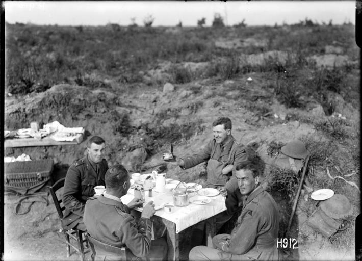 Keywords: blackandwhite monochrome outdoor black and white New Zealand officers eating breakfast in a trench that until two days previous had been occupied by German forces. Their breakfast included New Zealand butter that had just arrived in a parcel from home. Photograph taken by Henry Armytage Sanders in France or Belgium, 1918. Back of file print reads: `In a trench that two days before this picture was taken was occupied by Germans. Some New Zealand officers have breakfast in the open air - and enjoyed New Zealand butter just arrived in a gift parcel from home in New Zealand.' Quantity: 1 b&w original negative(s). Physical Description: Dry plate glass negative 4.75 x 6.5 inches New Zealand officers eating breakfast in captured German trenches. Royal New Zealand Returned and Services' Association :New Zealand official negatives, World War 1914-1918. Ref: 1/2-013488-G. Alexander Turnbull Library, Wellington, New Zealand. natlib.govt.nz/records/22769333 New Zealand officers eating breakfast in a trench that until two days previous had been occupied by German forces. Their breakfast included New Zealand butter that had just arrived in a parcel from home. Photograph taken by Henry Armytage Sanders in France or Belgium, 1918. Back of file print reads: `In a trench that two days before this picture was taken was occupied by Germans. Some New Zealand officers have breakfast in the open air - and enjoyed New Zealand butter just arrived in a gift parcel from home in New Zealand.' Quantity: 1 b&w original negative(s). Physical Description: Dry plate glass negative 4.75 x 6.5 inches New Zealand officers eating breakfast in captured German trenches. Royal New Zealand Returned and Services' Association :New Zealand official negatives, World War 1914-1918. Ref: 1/2-013488-G. Alexander Turnbull Library, Wellington, New Zealand. natlib.govt.nz/records/22769333 |