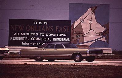 | Keywords: NewOrleansEast1972.jpg New Orleans 1972 Shows automobile passing sign This Is New Orleans East promoting new subdivision being developed to east of the city Billboard promoting the New Orleans East New Town development 1972 Note the darker-toned 'Current Development' portion encompassing present-day Village de L'Est and Oak Island as well as Venetian Isles and a sliver of Irish Bayou The light-toned portion is now mostly Bayou Sauvage National Wildlife Refuge Photograph by John Messina for Series DOCUMERICA The Environmental Protection Agency's Program to Photographically Document Subjects of Environmental Concern compiled 1972 - 1977 NARA-image 544287 1972-05 John Messina No restrictions PD-USGov <gallery> File LOUISIANA-NEW_ORLEANS_-_NARA_-_544287 tif tif File LOUISIANA-NEW_ORLEANS_-_NARA_-_544287 jpg jpg File NewOrleansEast1972 jpg Cropped jpg this </gallery> 1972 in New Orleans automobiles in New Orleans Eastern New Orleans Signs in New Orleans Billboards in Louisiana DOCUMERICA John Messina - DOCUMERICA |