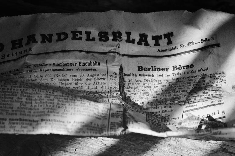 Keywords: newspaper daily newspaper handelsblatt pages font old script information old antique paper news close black and white recording