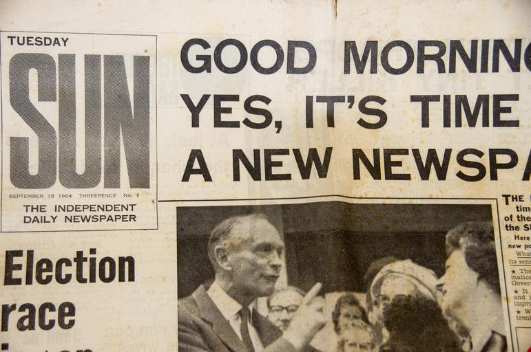Keywords: newspaper front page first edition headline print text the sun british 1964