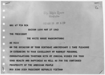 Keywords: Ngo-Dinh Diem Birthday Greetings to President Kennedy - NARA - 193709.tif Scope and content Message from Ngo-Dinh Diem to President Kennedy wishing him a happy birthday General notes 193709 Local identifier President 1961-1963 Kennedy Office of the Personal Secretary 1961 - 1963 John F Kennedy Library NLJFK Columbia Point Boston MA 02125-3398 1963-05-27 Record group Collection JFK-POF Papers of John F Kennedy President's Office Files 01/20/1961 - 11/22/1963 Record group ARC 1166 Papers of President Kennedy President's Office Files Countries compiled 01/20/1961 - 11/22/1963 Series ARC 193654 File unit Papers of President Kennedy President's Office Files Countries Vietnam General 1963 1963 - 1963 File unit ARC 193703 Variant control numbers NAIL Control Number NLK-POF-CNTRYS-VTNMGNRAL1963-WHTELDIEMTOPRES yes Other versions NARA-cooperation PD-USGov Ngo Dinh Diem Documents related toã John F Kennedy |