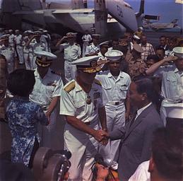 Keywords: Nguyen Van Thieu departing USS Constellation (CVA-64) 1968.jpg U S Navy Captain William R Flanagan Commanding officer of the aircraft carrier USS Constellation CVA-64 and Vice Admiral William F Bringle Commander of the Seventh Fleet shake hands with President and Madame Nguyen Van Thieu as they depart after a visit aboard ship in the South China Sea on 10 July 1968 In the background is the second production Grumman C-2A Greyhound BuNo 148148 which was assigned to Fleet Logistics Support Squadron VRC-50 Foo Dogs It was finally retired to the AMARC as 1C0005 on 19 June 1987 558520 1968-07-10 U S Navy PD-USGov-Military-Navy Aboard USS Constellation CV-64 Nguyen Van Thieu Admirals of the United States Navy Grumman C-2 Greyhound Fleet Logistics Support Squadron 50 United States Navy Handshakes involving the military Salutes |