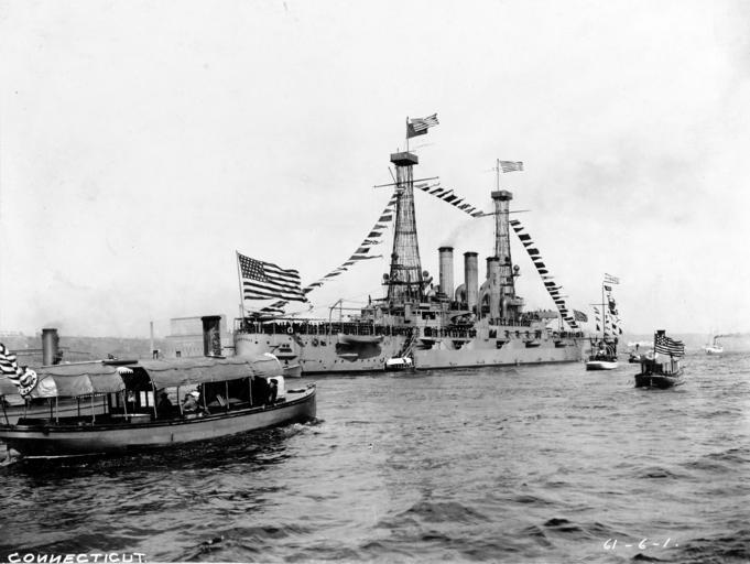 | Keywords: blackandwhite monochrome outdoor vehicle boat black and white NH 2325: USS Connecticut (Battleship # 18). Dressed with flags while at anchor in the Hudson River, off New York City, prior to World War I. The occasion may be the Fleet Review of October 1911. Steam launch at left is from USS Washington (Armored Cruiser # 11). U.S. Naval History and Heritage Command Photograph. (2016/01/18). NH 2325: USS Connecticut (Battleship # 18). Dressed with flags while at anchor in the Hudson River, off New York City, prior to World War I. The occasion may be the Fleet Review of October 1911. Steam launch at left is from USS Washington (Armored Cruiser # 11). U.S. Naval History and Heritage Command Photograph. (2016/01/18). |