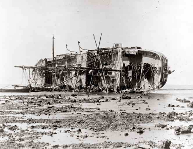 Keywords: outdoor monochrome NH 42288: German Gunboat Adler. Overturned on the reef, on the western side of Apia Harbor, Upolu, Samoa, during salvage work after the storm. Note the gun mounted on her poop deck, and bent propeller shaft visible at her stern. Naval History and Heritage Command Photograph. (2016/01/03). NH 42288: German Gunboat Adler. Overturned on the reef, on the western side of Apia Harbor, Upolu, Samoa, during salvage work after the storm. Note the gun mounted on her poop deck, and bent propeller shaft visible at her stern. Naval History and Heritage Command Photograph. (2016/01/03). |