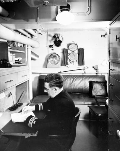 Keywords: blackandwhite monochrome black and white NH 56614 USS Brooklyn (CL-40). Scene in the Supply Officer's stateroom, 18 January 1938. The officer writing at the desk may be Lieutenant Commander Matthew T. Betton, USN(SC), who was Brooklyn's Supply Officer at the time. Note safe, with combination lock, installed as part of the desk; fan, electric heater, officer's sword and .45 caliber M1911 pistol on the bulkhead above the sofa. U.S. Naval History and Heritage Command Photograph. (OPA-NARA II-2016/02/24). NH 56614 USS Brooklyn (CL-40). Scene in the Supply Officer's stateroom, 18 January 1938. The officer writing at the desk may be Lieutenant Commander Matthew T. Betton, USN(SC), who was Brooklyn's Supply Officer at the time. Note safe, with combination lock, installed as part of the desk; fan, electric heater, officer's sword and .45 caliber M1911 pistol on the bulkhead above the sofa. U.S. Naval History and Heritage Command Photograph. (OPA-NARA II-2016/02/24). |