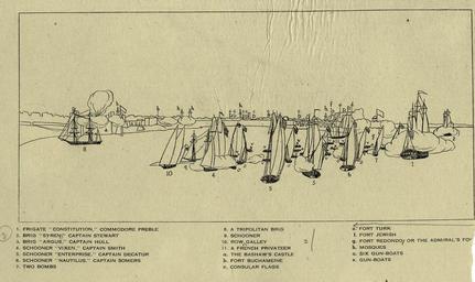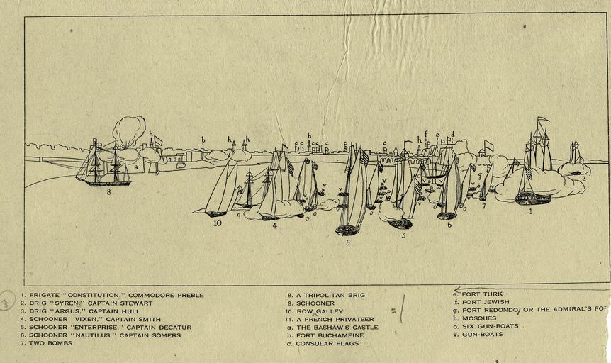 Keywords: text drawing sketch monochrome writing cartoon The Bombardment of Tripoli, 3 August 1804. Sketch shows the location of Preble’s Squadron on the first of five bombardments of the city of Tripoli. Ships taking part are: USS Constitution, USS Syren, USS Argus, USS Vixen, USS Enterprise, USS Nautilus. NHHC Photograph Collection, NH 56747. The Bombardment of Tripoli, 3 August 1804. Sketch shows the location of Preble’s Squadron on the first of five bombardments of the city of Tripoli. Ships taking part are: USS Constitution, USS Syren, USS Argus, USS Vixen, USS Enterprise, USS Nautilus. NHHC Photograph Collection, NH 56747. |