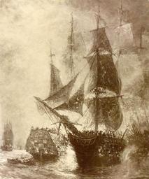| Keywords: outdoor monochrome Just what does “Bonhomme Richard” mean? Bonhomme Richard -- A French translation of Benjamin Franklin's nom de plume, "Poor Richard." When John Paul Jones received the Duc de Duras from the King of France, Louis XVI, he renamed the former French East Indiaman Bonhomme Richard to honor Franklin, the American Commissioner at Paris whose famous almanacs had been published in France under the title Les Maximes du Bonhomme Richard. Continental Navy Frigate Bonhomme Richard vs. HMS Serapis, action off Flamborough Head, England, 23 September 1779. Artwork by Carlton T. Champan. Courtesy of the Navy Art Collection, NH 61852. Just what does “Bonhomme Richard” mean? Bonhomme Richard -- A French translation of Benjamin Franklin's nom de plume, "Poor Richard." When John Paul Jones received the Duc de Duras from the King of France, Louis XVI, he renamed the former French East Indiaman Bonhomme Richard to honor Franklin, the American Commissioner at Paris whose famous almanacs had been published in France under the title Les Maximes du Bonhomme Richard. Continental Navy Frigate Bonhomme Richard vs. HMS Serapis, action off Flamborough Head, England, 23 September 1779. Artwork by Carlton T. Champan. Courtesy of the Navy Art Collection, NH 61852. |