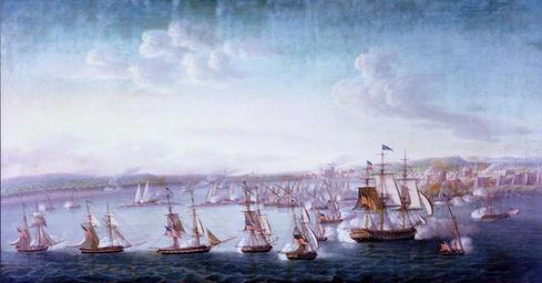 Keywords: NH 65536-KN.jpg en Photo NH 65536-KN color Bombardment of Tripoli 3 August 1804 Oil by Michael Felice Corne sic depicting Commodore Edward Preble's squadron engaging the Tripolitan gunboats and fortifications during the afternoon of 3 August 1804 <br /> U S Navy vessels shown in the foreground are from left to right schooner Enterprise schooner Nautilus brig Argus brig Siren or Syren schooner Vixen mortar boat Dent gunboat Somers frigate Constitution Preble's flagship mortar boat Robinson and gunboat Blake <br /> Attacking the enemy flotilla in the center background are Lieutenant Stephen Decatur's three gunboats and a gunboat commanded by Lieutenant James Decatur who was killed in this action Courtesy of the U S Naval Academy Museum Annapolis Maryland U S Naval History and Heritage Command Photograph 2012-06-18 http //www history navy mil/photos/images/h65000/h65536kc htm Michele Felice Cornè 1752 “1845 The US Naval History Heritage Command asserts <div style width 730px; font-family sans-serif; font-size 1em; margin-left auto; margin-right auto > <blockquote> Public Domain - To the best of our knowledge all images referenced in the Online Library are in the Public Domain They can be used by anyone for any purpose without obtaining our permission and without payment of usage fees </blockquote> <div style text-align right; font-style italic; margin-top -1em; > http //www history navy mil/branches/org11-4 htm </div></div> Custom license marker 2012 06 18 PD-old-auto-1923 1845 PD-USGov-Military-Navy Uploaded with UploadWizard Barbary Wars Edward Preble Michele Felice Cornè 1804 |