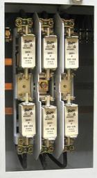 Keywords: NH-Sicherungen Hauptverteilung.jpg de NH-Sicherungen in einer Hauptverteilung en Knife fuses 50A with gG characteristic Also you can see here widespread mistakes 1 Load switch is not seen here person who will replace those fuses might be killed by arc easily; 2 Hot busbars are not separated by ribs like fuse sockets If electrician casually drops something metal there he will have quite serious skin burns to all his life long due to too high short-circuit current For example pliers or screwdriver are not melting at all during short circuit and they can't initiate immediate operation of the fuse fuse on distribution substation will trip only in 15 seconds after short circuit so electrician will be exposed to skin damaging during 15 seconds To correct mistakes there should be installed load switch with door mechanical constraint when you turn the lock to open the door it removes the voltage at same time which allows open the door only when voltage is removed But as those standarts are missing nobody does more safe way own Nogo 2010-08-03 Knife fuses Distribution boards |