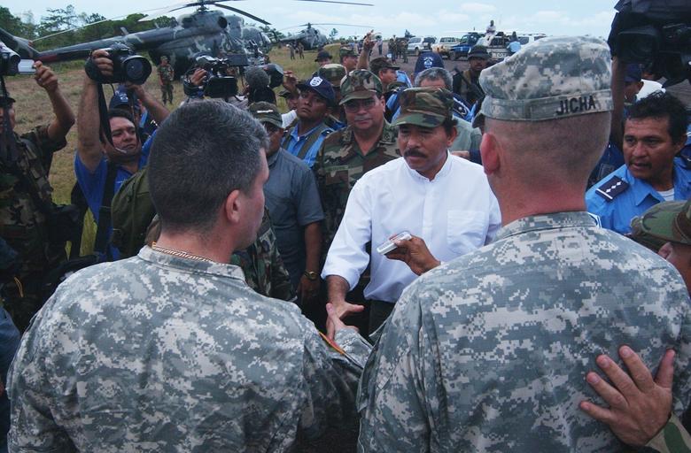 Keywords: Nicaragua honors U.S. service members for hurricane relief DVIDS67262.jpg en Nicaraguan President Daniel Ortega greets Army Capt Jon-Paul Lavandeira left and Lt Col Gregory Jicha both assigned to Joint Task Force-Bravo at Soto Cano Air Base Honduras after the soldiers' arrival at a small airfield Sept 5 The Army officers were part of a 13-person task force that deployed to Nicaragua to assess damage resulting from the storm U S Air Force photo/Tech Sgt Sonny Cohrs 2007-09-05 https //www dvidshub net/image/67262 67262 2007-12-04 18 09 MANAGUA NI PD-USGov Soto Cano Air Base Images from DoD uploaded by Fæ |