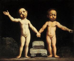 Keywords: Niccolò Musso, Ritratto dei gemelli Ercole Gioseffo e Angiola Maria Riario Sforza.jpg title Ritratto dei gemelli Ercole Gioseffo Riario Sforza e Angiola Maria Riario Sforza Portrait of the twins Ercole Gioseffo and Angiola Maria Riario Sforza http //www internationalauctioneers com/int/lot_detail asp LotID 43 AucID 6634 Oil on canvas Hercole Gioseffo et Angiola Maria quattro nati nell'anno MDCXIX a di XIII di Dicembre Filiuoli dell'Ill mo sig Mar <che>se Ferdinando Riario et dell'Ill ma S a Mar <che>sa Laura Pepoli 55 × 67 cm 1620 Niccolò Musso 1590 - after 1622 DEFAULTSORT Musso Niccolò PD-old-100 Young siblings in art 1620 Baroque portraits of children Twins in art House of Riario Sforza Ferdinando Riario 1620 paintings Italian inscriptions Nude babies female Nude babies male Niccolò Musso Laura Pepoli Holding hands in art |
