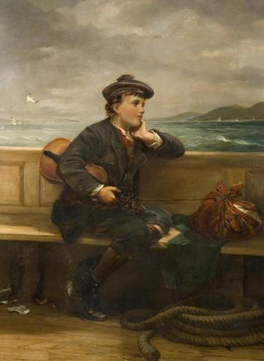 Keywords: Nicholas Chevalier, Seeking Fortune, oil on canvas.jpg Artwork creator Nicholas Chevalier Title Seeking Fortune In this work a young boy looks wistfully over the edge of the boat in which he is depicted His bundle is evidence of his leaving his violin is tucked under his arm and is perhaps obliquely referred to in the title 'Seeking Fortune' He wears a Scottish cap and is possibly leaving Glasgow In its addressing of the theme of emigration the work has much in common with Ford Madox Brown's The Last of England 1852-5 Exhibited for the first time in 1887 it has also been suggested that the painting depicts B L Farjeon a friend of the artist who in 1854 at age 16 left England for Australia 1887 oil on canvas Size object history exhibition history credit line accession number place of creation http //www europeana eu/portal/record/09405a/3B94BC8DF355032DA7A9643750619A94CF157559 html query Seeking+Fortune Vads PD-old-100 DEFAULTSORT Chevalier Nicholas Nicholas Chevalier 19th-century oil on canvas paintings 1880s paintings Oil paintings of boys Emigration in art 1887 Immigration in art People with musical instruments in art Paintings with signatures Males with watercraft 19th-century paintings location missing