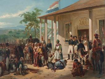 Keywords: Nicolaas Pieneman - The Submission of Prince Dipo Negoro to General De Kock.jpg Artwork Creator Nicolaas Pieneman The submission of Diepo Negoro to Lieutenant-General Hendrik Merkus Baron de Kock 28 March 1830 which ended the Java War 1825 “30 La rendición de Diponegoro ante el teniente general Hendrik Merkus barón de Kock 28 de marzo de 1830 en la que finalizó la Guerra de Java 1825 “1830 De onderwerping van Diepo Negoro aan luitenant-generaal Hendrik Merkus Baron de Kock 28 maart 1830 waarmee de Java-oorlog 1825 “30 werd beëindigd Penyerahan Pangeran Diponegoro di kotak kiri kepada Letnan Jenderal Hendrik Merkus de Kock di kotak kanan tanggal 28 Maret 1830 yang mengakhiri Perang Diponegoro 1825-1830 1835 oil canvas cm 77 100 Rijksmuseum Amsterdam source Inventory number SK-A-2238 Other versions <gallery> File Dutch Painting in the 19th Century - N Pieneman - The Surrender of Diepo Negoro png Dutch Painting in the 19th Century - N Pieneman - The Surrender of Diepo Negoro png File Nicolaas Pieneman - The Submission of Prince Dipo Negoro to General De Kock Rijksmuseum Official jpg Nicolaas Pieneman - The Submission of Prince Dipo Negoro to General De Kock Rijksmuseum Official jpg File Nicolaas Pieneman - The Submission of Prince Dipo Negoro to General De Kock Rijksmuseum Official HI-RES tiff Nicolaas Pieneman - The Submission of Prince Dipo Negoro to General De Kock Rijksmuseum Official HI-RES tiff De onderwerping van Diepo Negoro aan luitenant-generaal baron De Kock Rijksmuseum SK-A-2238 jpeg </gallery> 21 2007 Assessments 1 The Submission of Prince Dipo Negoro to General De Kock 1 PD-old-100 ImageNote 1 804 596 156 366 1600 1212 2 Diponegoro ImageNoteEnd 1 ImageNote 2 962 485 198 452 1600 1212 2 Hendrik Merkus de Kock ImageNoteEnd 2 Paintings by Nicolaas Pieneman in the Rijksmuseum Amsterdam Diponegoro 1785-1855 Hendrik Merkus Baron de Kock |