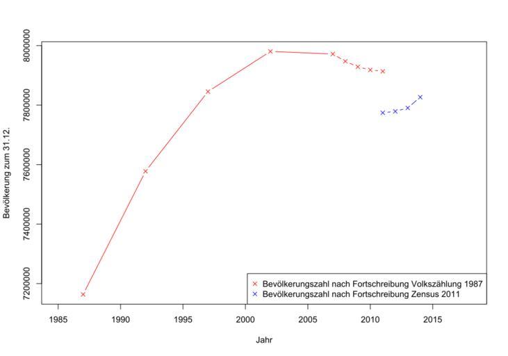 Keywords: Niedersachsen-bevoelkerungsentwicklung.svg Bevölkerungsentwicklung des Landes Niedersachsen 1987-2013 eigenes Werk Zahlen aus dem deutschen Wikipedia-Artikel Niedersachsen 2015-03-10 Tbhgeo Die Grafik wurde erzeugt mit dem folgenden R-Code <code><nowiki> bev1987 data frame jahr c 1987 1992 1997 2002 2007 2008 2009 2010 2011 bevoelkerungszahl c 7163602 7577520 7845398 7980472 7971684 7947244 7928815 7918293 7913502 bev2011 data frame jahr c 2011 2012 2013 2014 bevoelkerungszahl c 7774253 7778995 7790559 7826739 svg niedersachsen-bevoelkerungsentwicklung svg width 10 height 7 plot bev1987 bevoelkerungszahl ~ bev1987 jahr type b xlab Jahr xlim c 1985 2018 ylab Bevölkerung zum 31 12 pch 4 col red lines bev2011 bevoelkerungszahl ~ bev2011 jahr type b pch 4 col blue legend bottomright legend c Bevölkerungszahl nach Fortschreibung Volkszählung 1987 Bevölkerungszahl nach Fortschreibung Zensus 2011 col c red blue pch 4 dev off </nowiki> </code> PD-ineligible Cc-zero Demographic Charts of Germany