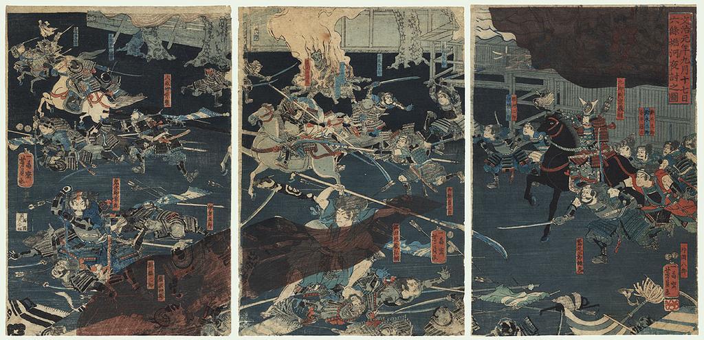 | Keywords: Night attack at Horikawa.jpg en Japanese Edo period wood block print of the famous night attack on Horikawa Castle where Minamoto no Yoshitsune sought refuge from his brother Yoritomo who eventually killed him in his quest to become absolute ruler of Japan The scene is one of chaos as samurais clash on foot and on horseback battling with swords and naginata as smoke and flames engulf the palace In the center a young warrior stands atop a fallen enemy gripping his weapon with both hands as he faces the attackers At right a general in a horned battle helmet directs his men with a tasseled command baton The ground is littered with broken arrows standards and abandoned weapons A dramatic night scene with wonderful detail in the expressive faces and setting Japanese Edo period wood block print book Yoshikazu 1800's PD-Japan Historic samurai prints PD-old-100 |