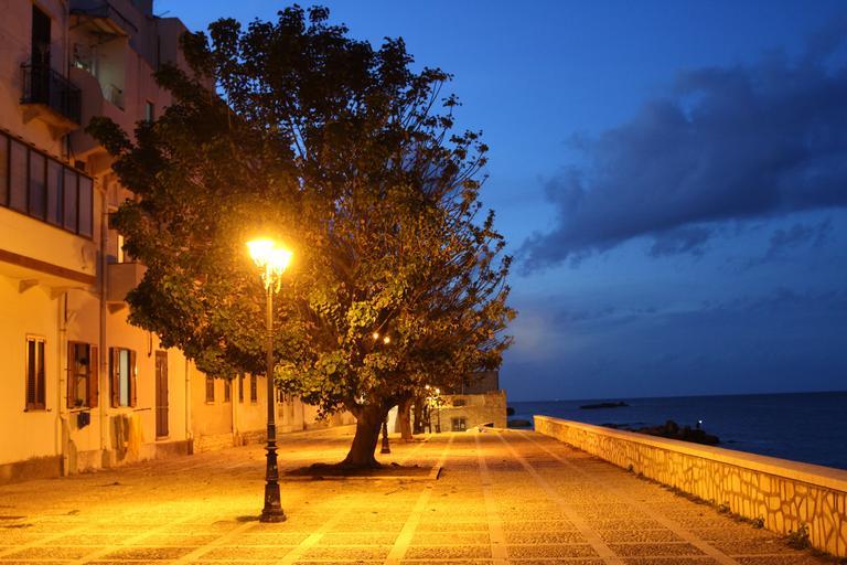 Keywords: night tree lamppost sky drills twilight evening city sea clouds light road piazza