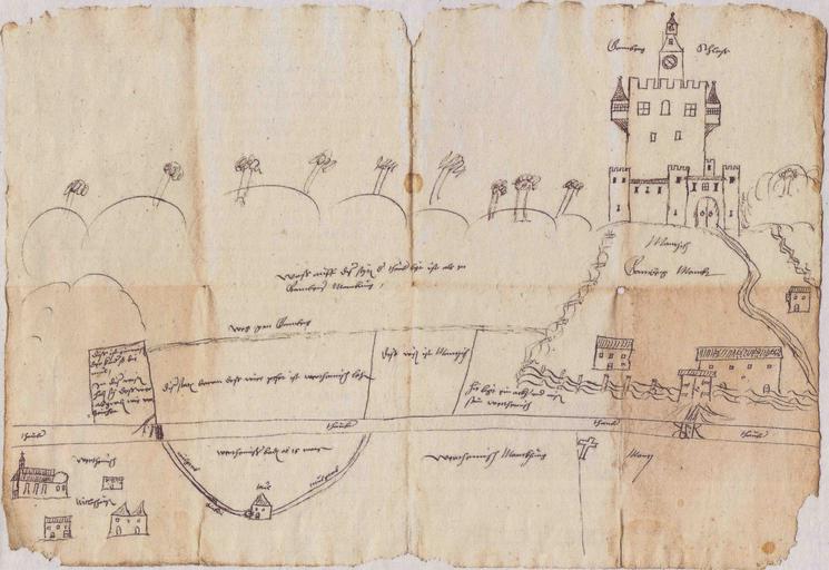 Keywords: Niklashausen und Gamburg um 1530.jpg Zeichnung von Niklashausen und Gamburg um 1530 <br />Links ist Niklashausen mit der Kirche zu sehen die auf der Zeichnung ohne Dach ist Sie wurde 1477 zerstört; der 1518 begonnene Wiederaufbau wurde jedoch nicht vollendet und der Chor erhielt sein Dach erst im 19 Jahrhundert Rechts von Niklashausen ist die Niklashäuser Mühle zu sehen; in der rechten Bildhälfte unten schließlich ein Flurkreuz das die Grenze zwischen der Gemarkung des kurmainzischen Herrshaftsbereichs und der der Grafschaft Wertheim markierte Oberhalb des Kreuzes ist - von einem Hagzaun umgeben - der Ort Gamburg angedeutet Auf dre Zeichnung ist nur das zweiflügelige Taubertor eingezeichnet; das Mühltor das Krappentor und das Tor zur Flur fehlen Die Gamburg selbst hier als Schloss bezeichnet ist überdimensioniert dargestellt Palais und Burgkapelle fehlen auf der Zeichnung obwohl sie zur Entstehungszeit schon vorhanden waren Die Turmuhr am Bergfried hat vermutlich nie existiert Originalformat 30 × 43 cm Scan aus der Wertheimer Zeitung vom 18 /19 August 2012 1530 author PD-old-100 Original upload log de wikipedia Rosenzweig CommonsHelper de wikipedia Niklashausen+und+Gamburg+um+1530 jpg 2012-08-19 07 11 Dem Zwickelbert sei Frau 5726×3934× 639248 bytes <nowiki> Information Zeichnung von Niklashausen und Gamburg um 1530 Scan aus der Wertheimer Zeitung vom 18 /19 August 2012 unbekannt ca 1530 Andere Versi ¦</nowiki> Werbach Gamburg Werbach |