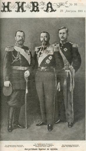 | Keywords: Nikolai II and George V and Albert I.jpg Августейшие б атья по о ужию Импе ато Все оссийский иколай II английский ко оль Гео г V и ко оль Бельгии Альбе т I ачало П В Об атите внимание на внешнее сходство одственников - ко оля Англии Гео га и усского ца я иколая являвшихся двою одніми б атьями Niva magazine cover from August 23 1914 showing Tsar Nicholas II left King George V of the United Kingdom center and King Albert I of Belgium right обложка жу нала ива от 23 августа 1914 года 1914 свой скан бумажного жу нала участником Vizu 2007 в жу нале не указан PD-1923 PD-RusEmpire original upload log page ru wikipedia D0 9D D0 B8 D0 BA D0 BE D0 BB D0 B0 D0 B9_II_ D0 B8_ D0 B0 D0 BD D0 B3 D0 BB D0 BA D0 BE D1 80 D0 BE D0 BB D1 8C_ D0 93 D0 B5 D0 BE D1 80 D0 B3_V_ D0 B8_ D0 BA D0 BE D1 80 D0 BE D0 BB D1 8C_ D0 91 D0 B5 D0 BB D1 8C D0 B3 D0 B8 D0 B8_ D0 90 D0 BB D1 8C D0 B1 D0 B5 D1 80 D1 82_I_ _1914 jpg 2007-08-01 12 05 Vizu 3758×6564× 4621999 bytes <nowiki> К аткое описание Изоб ажение Описание иколай_II_и_англ ко оль_Гео г_V_и_ко оль_Бельгии_Альбе т_I_ _1914 jpg Авто Участник Vizu В</nowiki> Nicholas II of Russia in 1914 George V of the United Kingdom Albert I of Belgium Niva magazine 1914 Military of the Russian Empire in old photos 1914-08-23 |