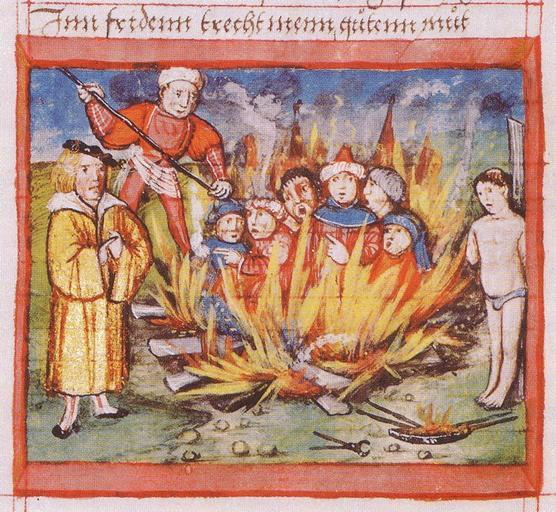 Keywords: Nikolaus Marschalk fol 103 judenverbrennung sternberg 1492.jpg de https //de wikipedia org/w/index php title Sternberger_Hostiensch C3 A4nderprozess curid 7204795 Judenverbrennung zu Sternberg unter Magnus II 1492 Miniatur 8 7 x 10 1 cm fol 103v In de Nikolaus Marschalk de Mecklenburgische Reimchronik Schweriner Kodex von 1521/23 de Landesbibliothek Mecklenburg-Vorpommern Signatur Ms 376 Text 1 Buch 81 Kapitel überschrieben Wie die Jodenn zum Sternberg vonn eynem priester hernn Peter das heilige Sacrament kaufftenn vnnd marterten vnnd Herzog Magnus sie lies verbornnen Vnnd weiter vonn Herzog Magnus vnnd Herzog Baltasars seynes bruders tode fol 104 cf http //digital ub uni-duesseldorf de/ihd/content/pageview/1597326 Textediton von 1739 In de Ernst Joachim Westphal http //digital ub uni-duesseldorf de/content/titleinfo/1598225 Monumenta inedita rerum Germanicarum Leipzig 1739-45 S 625-626 f Johannes Erichsen Hrsg 1000 Jahre Mecklenburg Rostock 1995 ISBN 3-356-00622-3 S 52 auch abgebildet und beschrieben In Michael Bischof Geschichtsbilder zwischen Fakt und Fabel Nikolaus Marschalks Mecklenburgische Reimchronik und ihre Miniaturen Lemgo 2006 ISBN 3-9807816-3-1 S 126 S 153f 1521/1523 Buchmaler unbekannt Nicolaus Marschalk Sternberg Stake in medieval miniature PD-old |