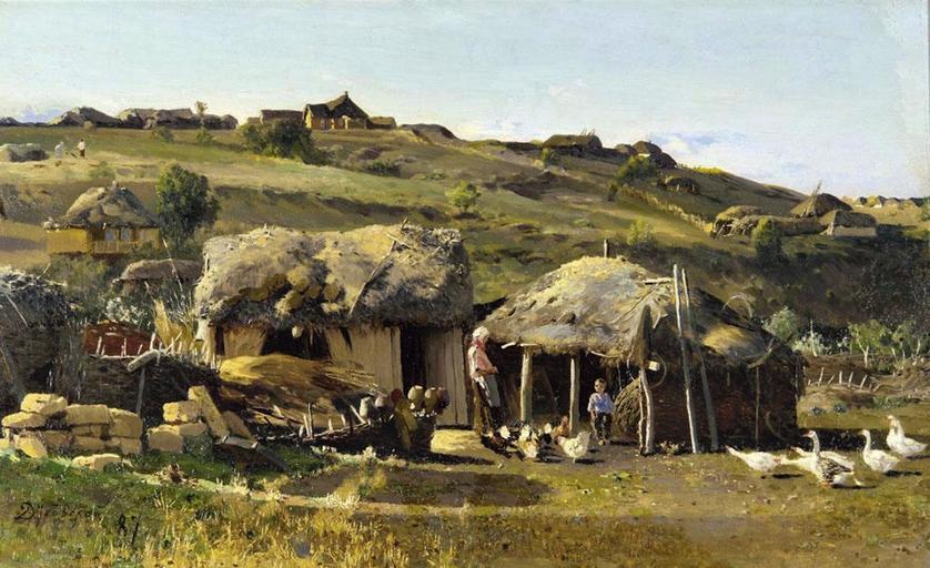 Keywords: nikolay dubovskoy painting art artistic artistry oil on canvas landscape sky clouds nature outside country countryside trees scenic huts houses homes hill summer spring people