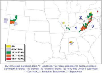 Keywords: NIOSH-2011-06+.jpg ru Рисунок 6 из обзо а п офзаболеваний шахтё ов http //www cdc gov/niosh/docs/2011-172/pdfs/2011-172 pdf Coal Mine Dust Exposures and Associated Health Outcomes Доля обследованных шахтё ов у кото ых азвивался быст о п ог есси ующий ант акоз - по егионам егионы с менее чем 5 обследованных не показаны Эти случаи сг уппи овались в цент альных Аппалачах Пенсильвания Западная Ви джиния и Кентукки Источник 22 en Figure 6 Percentage of evaluated miners with rapidly progressive coal workers pneumoconiosis by county not shown are counties with fewer than five miners evaluated Source Antao et al 22 2015-04-21 http //www cdc gov/niosh/docs/2011-172/pdfs/2011-172 pdf Coal Mine Dust Exposures and Associated Health Outcomes A Review of Information Published Since 1995 Michael Attfield et al NIOSH USA other versions PD-USGov National Institute for Occupational Safety and Health Mining Workplace safety Workplace safety of Russia Occupational diseases Miners Uploaded with UploadWizard