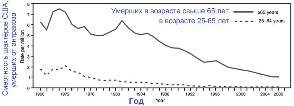 | Keywords: NIOSH-2011-14+.jpg ru Рисунок 14 из обзо а п офзаболеваний шахтё ов http //www cdc gov/niosh/docs/2011-172/pdfs/2011-172 pdf Coal Mine Dust Exposures and Associated Health Outcomes С едняя сме тность у шахтё ов уме ших в воз асте более 25 лет от ант акоза с учётом воз аста на 1 млн Видно неуклонное снижение с 7 сме тей на млн в 1969г до 1 в 2006г Источник 42 en Figure 14 Age-adjusted death rates per million for decedents age 25 years with coal workers pneumoconiosis as the underlying cause of death United States 1968 2006 Source CDC 42 2015-04-21 http //www cdc gov/niosh/docs/2011-172/pdfs/2011-172 pdf Coal Mine Dust Exposures and Associated Health Outcomes A Review of Information Published Since 1995 Michael Attfield et al NIOSH USA other versions PD-USGov National Institute for Occupational Safety and Health Mining Workplace safety Workplace safety of Russia Occupational diseases Miners Uploaded with UploadWizard |