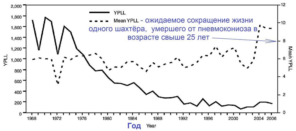 | Keywords: NIOSH-2011-15+.jpg ru Рисунок 15 из обзо а п офзаболеваний шахтё ов http //www cdc gov/niosh/docs/2011-172/pdfs/2011-172 pdf Coal Mine Dust Exposures and Associated Health Outcomes Потенциальное уменьшение п одолжительности жизни шахтё ов YPPL у шахтё ов моложе 65 лет снижается с 1500 до 200 в 2006г ; и с еднее снижение YPPL у шахтё ов уме ших от пневмокониоза в воз асте более 25 лет снижалось с 1968 до 1995г а затем начало асти Источник 42 en Figure 15 Years of potential life lost YPLL before age 65 and mean YPLL per decedent for decedents aged 25 years with coal workers pneumoconiosis as the underlying cause of death United States 1968 2006 Source CDC 42 2015-04-21 http //www cdc gov/niosh/docs/2011-172/pdfs/2011-172 pdf Coal Mine Dust Exposures and Associated Health Outcomes A Review of Information Published Since 1995 Michael Attfield et al NIOSH USA other versions PD-USGov National Institute for Occupational Safety and Health Mining Workplace safety Workplace safety of Russia Occupational diseases Miners Uploaded with UploadWizard |