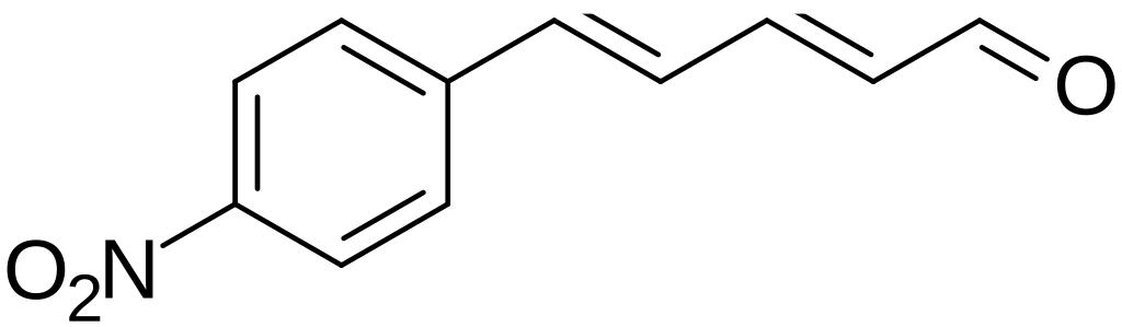 Keywords: Nitrophenyl pentadienal.svg Chemical structure of nitrophenyl pentadienal 2E 4E -5- 4-nitrophenyl -2 4-pentadienal Own 19 23 18 May 2016 UTC Ed Edgar181 Aldehydes Nitrobenzenes