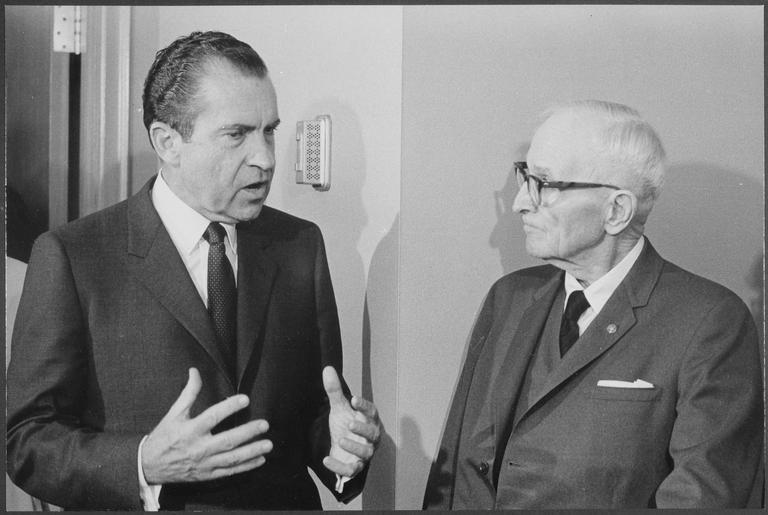 | Keywords: Nixon meeting with former President Harry S.Truman - NARA - 194615.tif Scope and content Pictured Richard M Nixon Harry S Truman Subject Past President's General notes 194615 Local identifier NLRN-WHPO-0562-17 General Services Administration National Archives and Records Service Office of Presidential Libraries Office of Presidential Papers 01/20/1969 - ca 12/1974 Most Recent <br /> President 1969-1974 Nixon White House Photo Office 1969 - 1974 Most Recent NARA-Author Atkins Oliver F 1916-1977 Photographer 8451334 <br /> Richard Nixon Library NLRN 18001 Yorba Linda Boulevard Yorba Linda CA 92886 1969-03-21 Record group Collection RN-WHPO White House Photo Office Collection Nixon Administration 01/20/1969 - 08/09/1974 Record group ARC 1179 Nixon White House Photographs compiled 01/20/1969 - 08/09/1974 documenting the period 08/08/1968 - 08/09/1974 Series ARC 194277 File unit File unit ARC Variant control numbers NAIL Control Number NLNP-WHPO-MPF-0562 17 yes Other versions NARA-cooperation PD-USGov DEFAULTSORT 19690321 March 1969 in the United States People of the United States in 1969 Politicians in 1969 Richard Nixon in 1969 Harry Truman with national leaders Photographs by Ollie Atkins Presidents of the United States together Richard Nixon with national leaders |