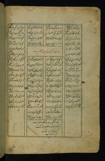 Keywords: Nizami Ganjavi - Colophon - Walters W60425B - Full Page.jpg This folio from Walters manuscript W 604 contains 1 of 4 short colophons in Arabic at the end of Makhzan al-asrar dated Ramadan 885 Khusraw va Shirin dated 1st Safar 885 Laylá va Majnun dated 5 Rabi' I 886 and Haft paykar dated 22 Ramadan 885 The name of the scribe is not recorded islamic 1481 885-886 Timurid ink pigments laid paper cm 23 5 16 accession number W 604 25B 83217 Henry Walters Baltimore date and mode of acquisition unknown Walters Art Museum Henry Walters Acquired by Henry Walters Transliteration place of origin Iran Walters Art Museum license 2D Khamsa of Nizami Timurid Walters MS 604 Media contributed by the Walters Art Museum needs category review Seven beauties Layla and Majnun Walters Art Museum Leyli and Majnun Nizami Ganjavi |
