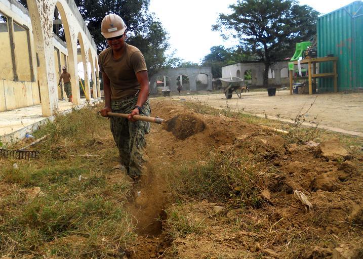 Keywords: NMCB 3 Pacific region deployment 130830-N-GU966-015.jpg en Builder 3rd Class Roberto Vega from Naval Mobile Construction Battalion 3's Civic Construction Action Detail in Timor-Leste digs a drainage ditch to help a local school remain flood free during the rainy season The CCAD's mission is to execute engineering civic assistance projects conduct formal training with the host nation and perform community relations events to help enhance shared capabilities and improve the country's social welfare One of the first battalions commissioned during World War II NMCB 3's legacy stands strong in its ability to build and fight anywhere in the world as either a full battalion or as a group of autonomous detachments simultaneously completing critical engineering and construction missions For this deployment NMCB 3 has split into nine details to perform critical construction projects in remote island areas such as Timor-Leste Tonga Cambodia and the Philippines The teams will also conduct operations in Atsugi Yokosuka and Okinawa Japan Chinhae Republic of Korea and China Lake Calif The naval construction force is a vital component of the U S maritime strategy They provide deployable battalions capable of providing disaster preparation and recovery support humanitarian assistance and combat operations support NMCB 3 provides combatant commanders and Navy component commanders with combat-ready warfighters capable of general engineering construction and limited combat engineering across the full range of military operations 2013-08-29 NMCB https //www dvidshub net/image/1009532 130830-N-GU966-015 2013-09-04 04 54 DILI TL PD-USGov-Military-Navy Naval Mobile Construction Battalion 3 Images from DoD uploaded by Fæ |