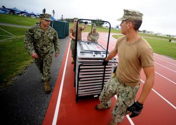 Keywords: NMCB 3 'Silent Heroes' provide KSO enthusiastic, critical support 131104-N-TD630-002.jpg en Seabees from Naval Mobile Construction Battalion 3 finish setting up tables before the kickoff of the 14th Annual Kadena Special Olympics Volunteers from Naval Mobile Construction Battalion 3 helped both prepare for the 14th Annual Kadena Special Olympics and cheered on athletes the day of the event The KSO was established by the 18th Wing commander in 1999 as an avenue to build relations with neighboring communities and local government representatives while providing a meaningful activity for the special needs children and adults The event has grown from approximately 100 athletes to more than 1 300 athletes and artists The program reaches out to more than 77 schools and special needs workshops throughout the island Through KSO both American and Japanese athletes had the opportunity to compete in the national games and world games NMCB 3's main body is deployed to Okinawa but has nine other details performing critical construction projects in remote island areas such as Timor-Leste Tonga Cambodia and the Philippines The teams will also conduct operations in Atsugi Yokosuka and Okinawa Japan; Chinhae Republic of Korea and China Lake Calif The naval construction force is a vital component of the U S maritime strategy They provide deployable battalions capable of providing disaster preparation and recovery support humanitarian assistance and combat operations support U S Navy photo by Builder Constructionman Laine Pulfer Naval Mobile Construction Battalion 3 Public Affairs 2013-11-04 Seaman Laine Pulfer https //www dvidshub net/image/1048341 131104-N-TD630-002 2013-11-07 00 55 OKINAWA JP PD-USGov-Military-Navy Naval Mobile Construction Battalion 3 Images from DoD uploaded by Fæ |