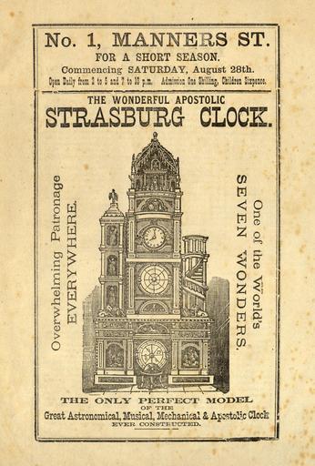 | Keywords: text ancient Shows a picture of the 12-foot high ornate clock, with painted panels, "the only perfect model of the great astronomical, musical, mechanical & apostolic clock ever constructed". The text inside describes the clock in detail (it featured St Peter and the Devil, Copernicus, and its constructor J B Schwilque), and gives the history of its construction. Quantity: 1 b&w photo-mechanical print(s) on folded leaflet.. Physical Description: Letterpress on front of leaflet, 245 x 174 mm. Search dates: 1886 - 1886 No 1, Manners St, for a short season commencing Saturday August 28th. The wonderful apostolic Strasburg clock. [1886?]. [Ephemera, pamphlets and booklets relating to clocks and watches, watch repair, time-keeping, time zones and daylight saving. 1800-2000s]. Ref: Eph-A-CLOCKS-1886-01. Alexander Turnbull Library, Wellington, New Zealand. natlib.govt.nz/records/23247781 Shows a picture of the 12-foot high ornate clock, with painted panels, "the only perfect model of the great astronomical, musical, mechanical & apostolic clock ever constructed". The text inside describes the clock in detail (it featured St Peter and the Devil, Copernicus, and its constructor J B Schwilque), and gives the history of its construction. Quantity: 1 b&w photo-mechanical print(s) on folded leaflet.. Physical Description: Letterpress on front of leaflet, 245 x 174 mm. Search dates: 1886 - 1886 No 1, Manners St, for a short season commencing Saturday August 28th. The wonderful apostolic Strasburg clock. [1886?]. [Ephemera, pamphlets and booklets relating to clocks and watches, watch repair, time-keeping, time zones and daylight saving. 1800-2000s]. Ref: Eph-A-CLOCKS-1886-01. Alexander Turnbull Library, Wellington, New Zealand. natlib.govt.nz/records/23247781 |