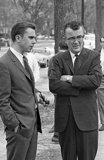 Keywords: blackandwhite people monochrome outdoor black and white On June 26, 1963, the North Carolina General Assembly passed the Act to Regulate Visiting Speakers, later known as the Speaker Ban Law. The law forbade anyone to speak on a University of North Carolina campus who was a known member of the Communist Party, was known to advocate overthrow of the United States Constitution, or had invoked the Fifth Amendment in respect of communist or "subversive" connections. The law was rushed through in the closing hours of the legislative session with virtually no debate. Governor Terry Sanford was against the Speaker Ban bill, but at that time the governor of North Carolina could not veto legislation. In the wake of the passage of this law, the communities on the UNC campuses rose up in protest. Students, faculty, and community members protested the law and what it represented over the course of the next several years. A number of complex issues involving many key North Carolina political figures and national leaders kept the controversy very active and widely debated through the mid-1960's. In 1965, the North Carolina General Assembly established a commission to look into the consequenses of the law and recommend either ammedment or repeal of the law. The commission held public hearings in August and September of 1965 and in November amended the law absolving the state legislature from having to make rulings on who could speak on campuses and who could not and returning effective control over those issues to the universities. (Speaker Ban Law Study Commission records are held by the State Archives of North Carolina; finding aid is online www.archives.ncdcr.gov/findingaids/pdf/sa_speaker_ban_law...). In 1966 students at the University of North Carolina at Chapel Hill led by Student Body President Paul Dickson invited Herbert Aptheker and Frank Wilkinson ('known' Communists) to speak on the campus. As expected, the university refused to allow either of the speakers to give their speeches on campus. Instead, they addressed the assembled crowd on March 2, 1966, from across the stone wall that separates the university from the town of Chapel Hill. Ultimately a federal law suit against the university and the State of North Carolina was filed by UNC students. On February 19, 1968, after two years of consideration by the Federal District Court in Greensboro, Dickson, et al. v Sitterson, et al. was decided for the plaintiffs -- the court's opinion found the Speaker Ban law and policy unconstitutional. For more information on the Speaker Ban Law, its complexities, and surrounding events, please see this online exhibit and collection www.lib.unc.edu/mss/exhibits/protests/ban.html, NCpedia entry ncpedia.org/speaker-ban-law, and www.northcarolinahistory.org/commentary/187/entry/, used in the drafting of the above description of this set of images. COPYRIGHTED BY THE RALEIGH NEWS AND OBSERVER NEWSPAPER. DO NOT USE OR PUBLISH WITHOUT EXPRESSED CONSENT FROM THE N&O. On June 26, 1963, the North Carolina General Assembly passed the Act to Regulate Visiting Speakers, later known as the Speaker Ban Law. The law forbade anyone to speak on a University of North Carolina campus who was a known member of the Communist Party, was known to advocate overthrow of the United States Constitution, or had invoked the Fifth Amendment in respect of communist or "subversive" connections. The law was rushed through in the closing hours of the legislative session with virtually no debate. Governor Terry Sanford was against the Speaker Ban bill, but at that time the governor of North Carolina could not veto legislation. In the wake of the passage of this law, the communities on the UNC campuses rose up in protest. Students, faculty, and community members protested the law and what it represented over the course of the next several years. A number of complex issues involving many key North Carolina political figures and national leaders kept the controversy very active and widely debated through the mid-1960's. In 1965, the North Carolina General Assembly established a commission to look into the consequenses of the law and recommend either ammedment or repeal of the law. The commission held public hearings in August and September of 1965 and in November amended the law absolving the state legislature from having to make rulings on who could speak on campuses and who could not and returning effective control over those issues to the universities. (Speaker Ban Law Study Commission records are held by the State Archives of North Carolina; finding aid is online www.archives.ncdcr.gov/findingaids/pdf/sa_speaker_ban_law...). In 1966 students at the University of North Carolina at Chapel Hill led by Student Body President Paul Dickson invited Herbert Aptheker and Frank Wilkinson ('known' Communists) to speak on the campus. As expected, the university refused to allow either of the speakers to give their speeches on campus. Instead, they addressed the assembled crowd on March 2, 1966, from across the stone wall that separates the university from the town of Chapel Hill. Ultimately a federal law suit against the university and the State of North Carolina was filed by UNC students. On February 19, 1968, after two years of consideration by the Federal District Court in Greensboro, Dickson, et al. v Sitterson, et al. was decided for the plaintiffs -- the court's opinion found the Speaker Ban law and policy unconstitutional. For more information on the Speaker Ban Law, its complexities, and surrounding events, please see this online exhibit and collection www.lib.unc.edu/mss/exhibits/protests/ban.html, NCpedia entry ncpedia.org/speaker-ban-law, and www.northcarolinahistory.org/commentary/187/entry/, used in the drafting of the above description of this set of images. COPYRIGHTED BY THE RALEIGH NEWS AND OBSERVER NEWSPAPER. DO NOT USE OR PUBLISH WITHOUT EXPRESSED CONSENT FROM THE N&O. |