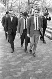 Keywords: blackandwhite people monochrome outdoor black and white On June 26, 1963, the North Carolina General Assembly passed the Act to Regulate Visiting Speakers, later known as the Speaker Ban Law. The law forbade anyone to speak on a University of North Carolina campus who was a known member of the Communist Party, was known to advocate overthrow of the United States Constitution, or had invoked the Fifth Amendment in respect of communist or "subversive" connections. The law was rushed through in the closing hours of the legislative session with virtually no debate. Governor Terry Sanford was against the Speaker Ban bill, but at that time the governor of North Carolina could not veto legislation. In the wake of the passage of this law, the communities on the UNC campuses rose up in protest. Students, faculty, and community members protested the law and what it represented over the course of the next several years. A number of complex issues involving many key North Carolina political figures and national leaders kept the controversy very active and widely debated through the mid-1960's. In 1965, the North Carolina General Assembly established a commission to look into the consequenses of the law and recommend either ammedment or repeal of the law. The commission held public hearings in August and September of 1965 and in November amended the law absolving the state legislature from having to make rulings on who could speak on campuses and who could not and returning effective control over those issues to the universities. (Speaker Ban Law Study Commission records are held by the State Archives of North Carolina; finding aid is online www.archives.ncdcr.gov/findingaids/pdf/sa_speaker_ban_law...). In 1966 students at the University of North Carolina at Chapel Hill led by Student Body President Paul Dickson invited Herbert Aptheker and Frank Wilkinson ('known' Communists) to speak on the campus. As expected, the university refused to allow either of the speakers to give their speeches on campus. Instead, they addressed the assembled crowd on March 2, 1966, from across the stone wall that separates the university from the town of Chapel Hill. Ultimately a federal law suit against the university and the State of North Carolina was filed by UNC students. On February 19, 1968, after two years of consideration by the Federal District Court in Greensboro, Dickson, et al. v Sitterson, et al. was decided for the plaintiffs -- the court's opinion found the Speaker Ban law and policy unconstitutional. For more information on the Speaker Ban Law, its complexities, and surrounding events, please see this online exhibit and collection www.lib.unc.edu/mss/exhibits/protests/ban.html, NCpedia entry ncpedia.org/speaker-ban-law, and www.northcarolinahistory.org/commentary/187/entry/, used in the drafting of the above description of this set of images. COPYRIGHTED BY THE RALEIGH NEWS AND OBSERVER NEWSPAPER. DO NOT USE OR PUBLISH WITHOUT EXPRESSED CONSENT FROM THE N&O. On June 26, 1963, the North Carolina General Assembly passed the Act to Regulate Visiting Speakers, later known as the Speaker Ban Law. The law forbade anyone to speak on a University of North Carolina campus who was a known member of the Communist Party, was known to advocate overthrow of the United States Constitution, or had invoked the Fifth Amendment in respect of communist or "subversive" connections. The law was rushed through in the closing hours of the legislative session with virtually no debate. Governor Terry Sanford was against the Speaker Ban bill, but at that time the governor of North Carolina could not veto legislation. In the wake of the passage of this law, the communities on the UNC campuses rose up in protest. Students, faculty, and community members protested the law and what it represented over the course of the next several years. A number of complex issues involving many key North Carolina political figures and national leaders kept the controversy very active and widely debated through the mid-1960's. In 1965, the North Carolina General Assembly established a commission to look into the consequenses of the law and recommend either ammedment or repeal of the law. The commission held public hearings in August and September of 1965 and in November amended the law absolving the state legislature from having to make rulings on who could speak on campuses and who could not and returning effective control over those issues to the universities. (Speaker Ban Law Study Commission records are held by the State Archives of North Carolina; finding aid is online www.archives.ncdcr.gov/findingaids/pdf/sa_speaker_ban_law...). In 1966 students at the University of North Carolina at Chapel Hill led by Student Body President Paul Dickson invited Herbert Aptheker and Frank Wilkinson ('known' Communists) to speak on the campus. As expected, the university refused to allow either of the speakers to give their speeches on campus. Instead, they addressed the assembled crowd on March 2, 1966, from across the stone wall that separates the university from the town of Chapel Hill. Ultimately a federal law suit against the university and the State of North Carolina was filed by UNC students. On February 19, 1968, after two years of consideration by the Federal District Court in Greensboro, Dickson, et al. v Sitterson, et al. was decided for the plaintiffs -- the court's opinion found the Speaker Ban law and policy unconstitutional. For more information on the Speaker Ban Law, its complexities, and surrounding events, please see this online exhibit and collection www.lib.unc.edu/mss/exhibits/protests/ban.html, NCpedia entry ncpedia.org/speaker-ban-law, and www.northcarolinahistory.org/commentary/187/entry/, used in the drafting of the above description of this set of images. COPYRIGHTED BY THE RALEIGH NEWS AND OBSERVER NEWSPAPER. DO NOT USE OR PUBLISH WITHOUT EXPRESSED CONSENT FROM THE N&O. |