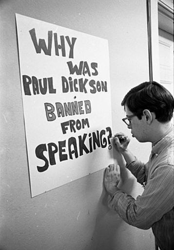 Keywords: blackandwhite monochrome text black and white On June 26, 1963, the North Carolina General Assembly passed the Act to Regulate Visiting Speakers, later known as the Speaker Ban Law. The law forbade anyone to speak on a University of North Carolina campus who was a known member of the Communist Party, was known to advocate overthrow of the United States Constitution, or had invoked the Fifth Amendment in respect of communist or "subversive" connections. The law was rushed through in the closing hours of the legislative session with virtually no debate. Governor Terry Sanford was against the Speaker Ban bill, but at that time the governor of North Carolina could not veto legislation. In the wake of the passage of this law, the communities on the UNC campuses rose up in protest. Students, faculty, and community members protested the law and what it represented over the course of the next several years. A number of complex issues involving many key North Carolina political figures and national leaders kept the controversy very active and widely debated through the mid-1960's. In 1965, the North Carolina General Assembly established a commission to look into the consequenses of the law and recommend either ammedment or repeal of the law. The commission held public hearings in August and September of 1965 and in November amended the law absolving the state legislature from having to make rulings on who could speak on campuses and who could not and returning effective control over those issues to the universities. (Speaker Ban Law Study Commission records are held by the State Archives of North Carolina; finding aid is online www.archives.ncdcr.gov/findingaids/pdf/sa_speaker_ban_law...). In 1966 students at the University of North Carolina at Chapel Hill led by Student Body President Paul Dickson invited Herbert Aptheker and Frank Wilkinson ('known' Communists) to speak on the campus. As expected, the university refused to allow either of the speakers to give their speeches on campus. Instead, they addressed the assembled crowd on March 2, 1966, from across the stone wall that separates the university from the town of Chapel Hill. Ultimately a federal law suit against the university and the State of North Carolina was filed by UNC students. On February 19, 1968, after two years of consideration by the Federal District Court in Greensboro, Dickson, et al. v Sitterson, et al. was decided for the plaintiffs -- the court's opinion found the Speaker Ban law and policy unconstitutional. For more information on the Speaker Ban Law, its complexities, and surrounding events, please see this online exhibit and collection www.lib.unc.edu/mss/exhibits/protests/ban.html, NCpedia entry ncpedia.org/speaker-ban-law, and www.northcarolinahistory.org/commentary/187/entry/, used in the drafting of the above description of this set of images. COPYRIGHTED BY THE RALEIGH NEWS AND OBSERVER NEWSPAPER. DO NOT USE OR PUBLISH WITHOUT EXPRESSED CONSENT FROM THE N&O. On June 26, 1963, the North Carolina General Assembly passed the Act to Regulate Visiting Speakers, later known as the Speaker Ban Law. The law forbade anyone to speak on a University of North Carolina campus who was a known member of the Communist Party, was known to advocate overthrow of the United States Constitution, or had invoked the Fifth Amendment in respect of communist or "subversive" connections. The law was rushed through in the closing hours of the legislative session with virtually no debate. Governor Terry Sanford was against the Speaker Ban bill, but at that time the governor of North Carolina could not veto legislation. In the wake of the passage of this law, the communities on the UNC campuses rose up in protest. Students, faculty, and community members protested the law and what it represented over the course of the next several years. A number of complex issues involving many key North Carolina political figures and national leaders kept the controversy very active and widely debated through the mid-1960's. In 1965, the North Carolina General Assembly established a commission to look into the consequenses of the law and recommend either ammedment or repeal of the law. The commission held public hearings in August and September of 1965 and in November amended the law absolving the state legislature from having to make rulings on who could speak on campuses and who could not and returning effective control over those issues to the universities. (Speaker Ban Law Study Commission records are held by the State Archives of North Carolina; finding aid is online www.archives.ncdcr.gov/findingaids/pdf/sa_speaker_ban_law...). In 1966 students at the University of North Carolina at Chapel Hill led by Student Body President Paul Dickson invited Herbert Aptheker and Frank Wilkinson ('known' Communists) to speak on the campus. As expected, the university refused to allow either of the speakers to give their speeches on campus. Instead, they addressed the assembled crowd on March 2, 1966, from across the stone wall that separates the university from the town of Chapel Hill. Ultimately a federal law suit against the university and the State of North Carolina was filed by UNC students. On February 19, 1968, after two years of consideration by the Federal District Court in Greensboro, Dickson, et al. v Sitterson, et al. was decided for the plaintiffs -- the court's opinion found the Speaker Ban law and policy unconstitutional. For more information on the Speaker Ban Law, its complexities, and surrounding events, please see this online exhibit and collection www.lib.unc.edu/mss/exhibits/protests/ban.html, NCpedia entry ncpedia.org/speaker-ban-law, and www.northcarolinahistory.org/commentary/187/entry/, used in the drafting of the above description of this set of images. COPYRIGHTED BY THE RALEIGH NEWS AND OBSERVER NEWSPAPER. DO NOT USE OR PUBLISH WITHOUT EXPRESSED CONSENT FROM THE N&O.