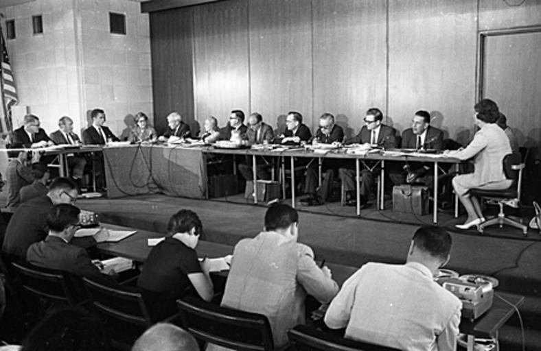 Keywords: blackandwhite monochrome room indoor black and white Inside the North Carolina State Legislative Building, August 1965. On June 26, 1963, the North Carolina General Assembly passed the Act to Regulate Visiting Speakers, later known as the Speaker Ban Law. The law forbade anyone to speak on a University of North Carolina campus who was a known member of the Communist Party, was known to advocate overthrow of the United States Constitution, or had invoked the Fifth Amendment in respect of communist or "subversive" connections. The law was rushed through in the closing hours of the legislative session with virtually no debate. Governor Terry Sanford was against the Speaker Ban bill, but at that time the governor of North Carolina could not veto legislation. In the wake of the passage of this law, the communities on the UNC campuses rose up in protest. Students, faculty, and community members protested the law and what it represented over the course of the next several years. A number of complex issues involving many key North Carolina political figures and national leaders kept the controversy very active and widely debated through the mid-1960's. In 1965, the North Carolina General Assembly established a commission to look into the consequenses of the law and recommend either ammedment or repeal of the law. The commission held public hearings in August and September of 1965 and in November amended the law absolving the state legislature from having to make rulings on who could speak on campuses and who could not and returning effective control over those issues to the universities. (Speaker Ban Law Study Commission records are held by the State Archives of North Carolina; finding aid is online www.archives.ncdcr.gov/findingaids/pdf/sa_speaker_ban_law...). In 1966 students at the University of North Carolina at Chapel Hill led by Student Body President Paul Dickson invited Herbert Aptheker and Frank Wilkinson ('known' Communists) to speak on the campus. As expected, the university refused to allow either of the speakers to give their speeches on campus. Instead, they addressed the assembled crowd on March 2, 1966, from across the stone wall that separates the university from the town of Chapel Hill. Ultimately a federal law suit against the university and the State of North Carolina was filed by UNC students. On February 19, 1968, after two years of consideration by the Federal District Court in Greensboro, Dickson, et al. v Sitterson, et al. was decided for the plaintiffs -- the court's opinion found the Speaker Ban law and policy unconstitutional. For more information on the Speaker Ban Law, its complexities, and surrounding events, please see this online exhibit and collection www.lib.unc.edu/mss/exhibits/protests/ban.html, NCpedia entry ncpedia.org/speaker-ban-law, and www.northcarolinahistory.org/commentary/187/entry/, used in the drafting of the above description of this set of images. COPYRIGHTED BY THE RALEIGH NEWS AND OBSERVER NEWSPAPER. DO NOT USE OR PUBLISH WITHOUT EXPRESSED CONSENT FROM THE N&O. Inside the North Carolina State Legislative Building, August 1965. On June 26, 1963, the North Carolina General Assembly passed the Act to Regulate Visiting Speakers, later known as the Speaker Ban Law. The law forbade anyone to speak on a University of North Carolina campus who was a known member of the Communist Party, was known to advocate overthrow of the United States Constitution, or had invoked the Fifth Amendment in respect of communist or "subversive" connections. The law was rushed through in the closing hours of the legislative session with virtually no debate. Governor Terry Sanford was against the Speaker Ban bill, but at that time the governor of North Carolina could not veto legislation. In the wake of the passage of this law, the communities on the UNC campuses rose up in protest. Students, faculty, and community members protested the law and what it represented over the course of the next several years. A number of complex issues involving many key North Carolina political figures and national leaders kept the controversy very active and widely debated through the mid-1960's. In 1965, the North Carolina General Assembly established a commission to look into the consequenses of the law and recommend either ammedment or repeal of the law. The commission held public hearings in August and September of 1965 and in November amended the law absolving the state legislature from having to make rulings on who could speak on campuses and who could not and returning effective control over those issues to the universities. (Speaker Ban Law Study Commission records are held by the State Archives of North Carolina; finding aid is online www.archives.ncdcr.gov/findingaids/pdf/sa_speaker_ban_law...). In 1966 students at the University of North Carolina at Chapel Hill led by Student Body President Paul Dickson invited Herbert Aptheker and Frank Wilkinson ('known' Communists) to speak on the campus. As expected, the university refused to allow either of the speakers to give their speeches on campus. Instead, they addressed the assembled crowd on March 2, 1966, from across the stone wall that separates the university from the town of Chapel Hill. Ultimately a federal law suit against the university and the State of North Carolina was filed by UNC students. On February 19, 1968, after two years of consideration by the Federal District Court in Greensboro, Dickson, et al. v Sitterson, et al. was decided for the plaintiffs -- the court's opinion found the Speaker Ban law and policy unconstitutional. For more information on the Speaker Ban Law, its complexities, and surrounding events, please see this online exhibit and collection www.lib.unc.edu/mss/exhibits/protests/ban.html, NCpedia entry ncpedia.org/speaker-ban-law, and www.northcarolinahistory.org/commentary/187/entry/, used in the drafting of the above description of this set of images. COPYRIGHTED BY THE RALEIGH NEWS AND OBSER